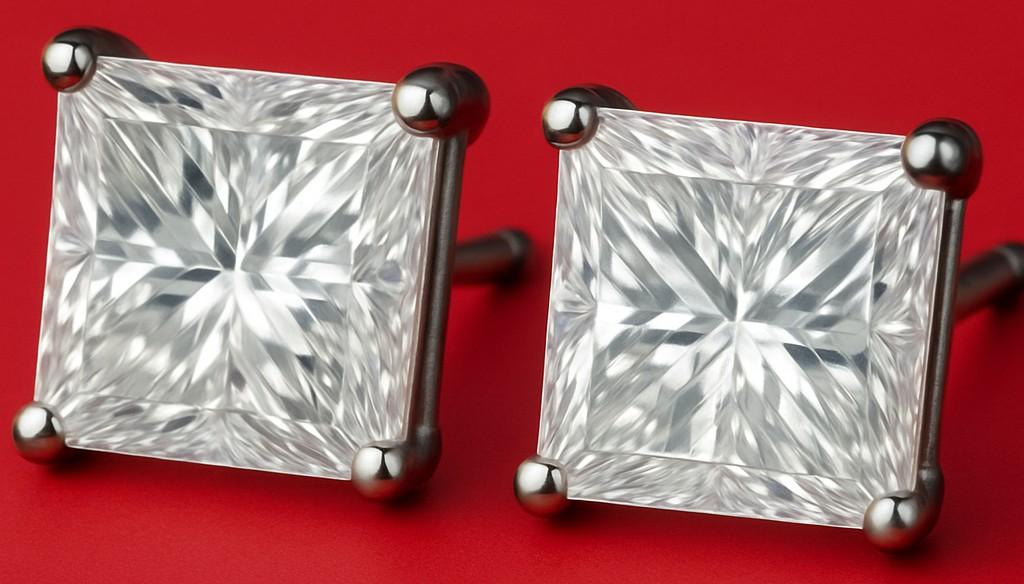 One New Pair of Princess Cut Diamond Stud Earrings. Set In Sterling Silver Mountings.