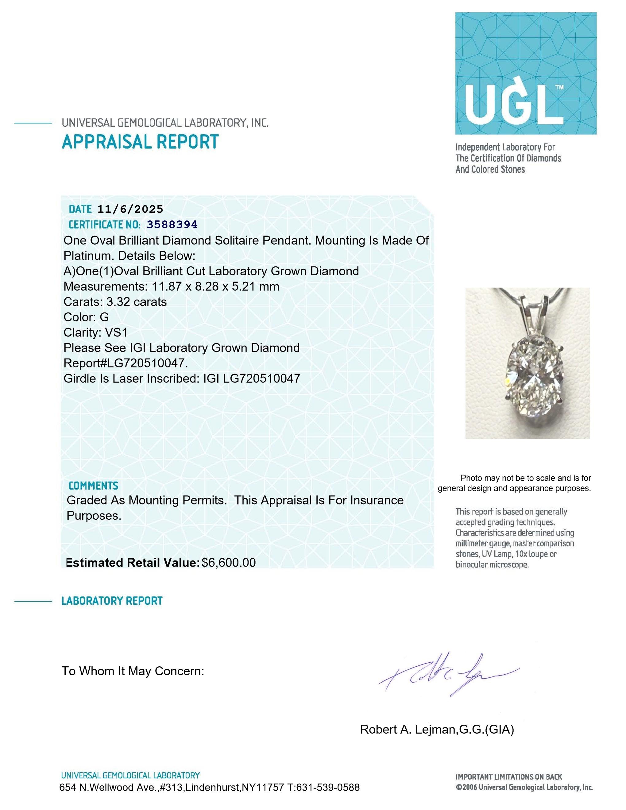 New Platinum 3.32 Carats Lab Grown Diamond Pendant G, VS1 | Estimated Retail Value: $6,600 (UGL & IGI)