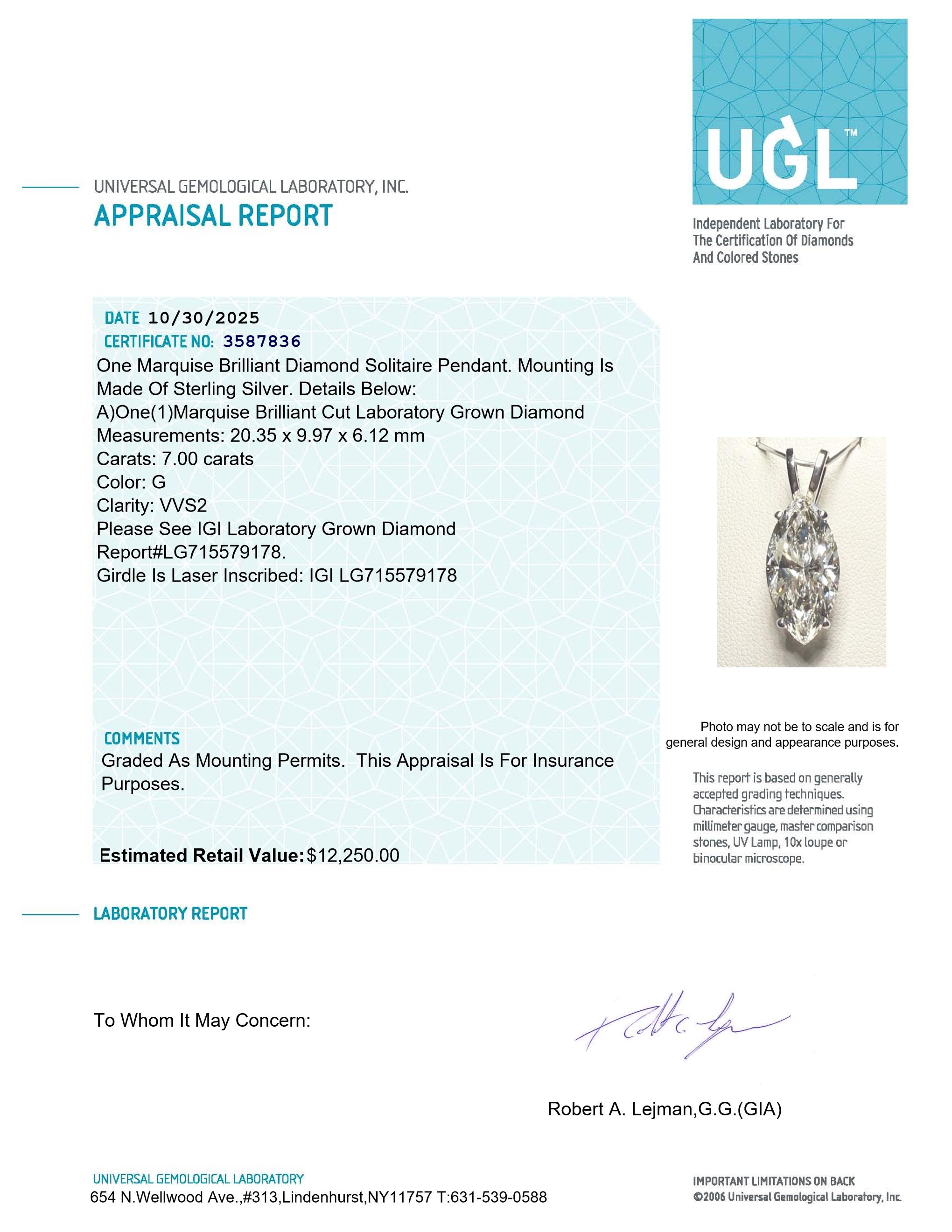 New 7.00 Carats Lab Grown Diamond Pendant G, VVS2 | Estimated Retail Value: $12,250 (UGL & IGI)