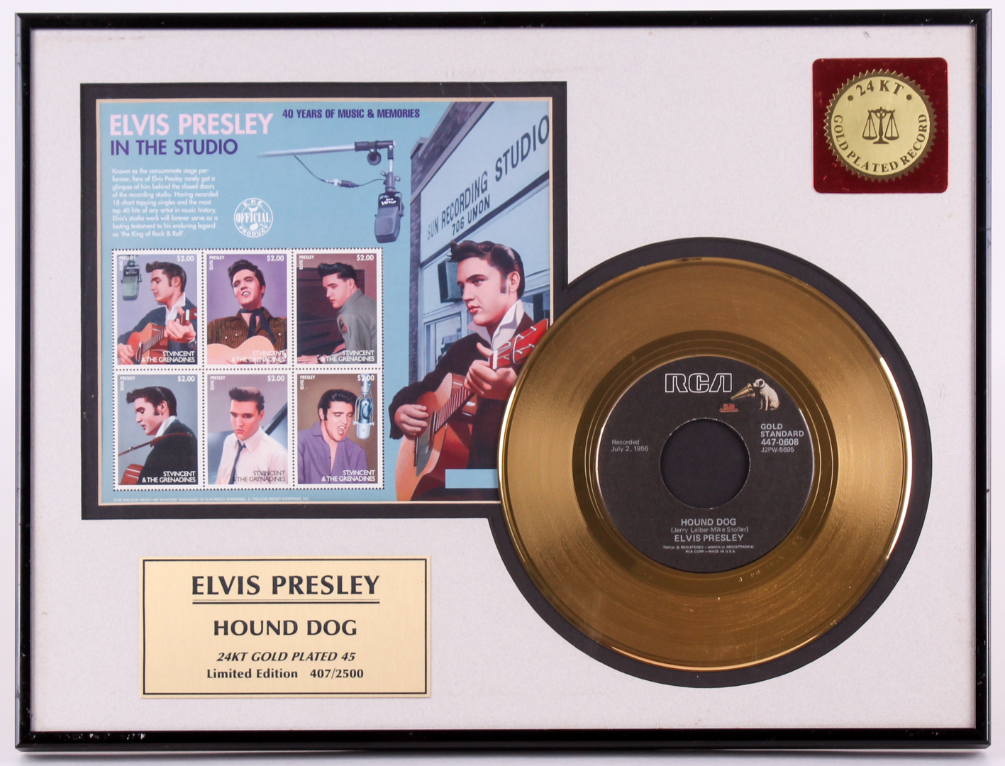 This custom framed record measures approximately 12.25" x 16.25" in size and features a 24K gold plated record dated July 2, 1956 and a sheet of Elvis Presley stamps.