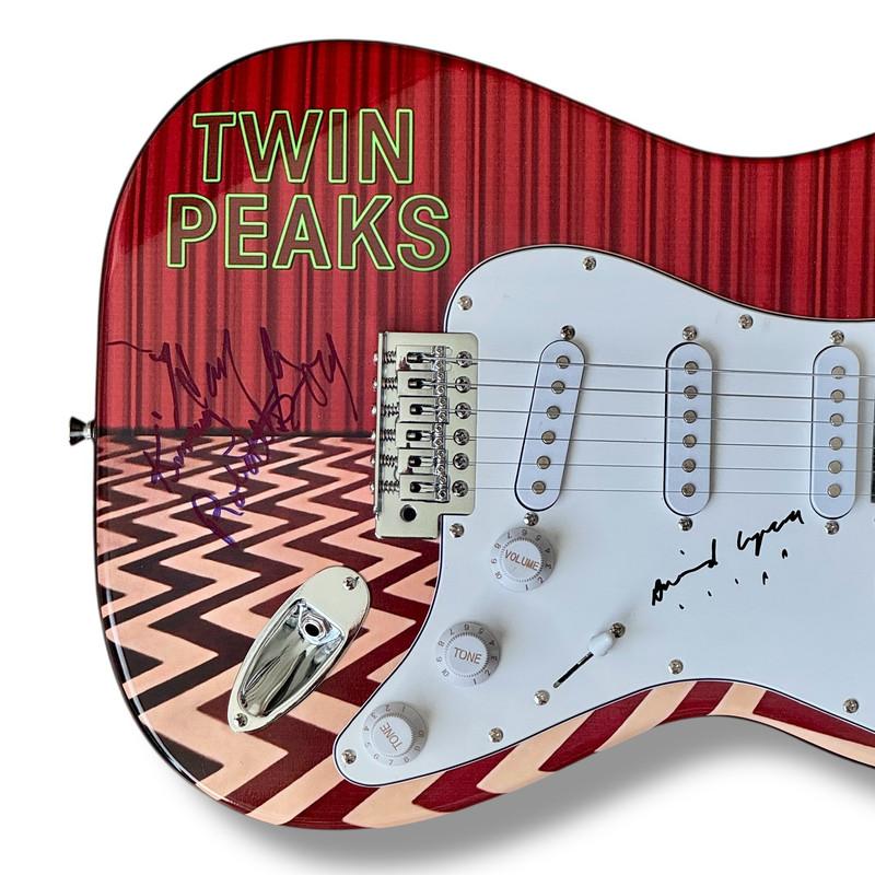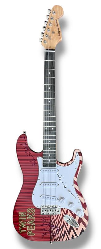Custom Twin Peaks Stratocaster style electric guitar measures approximately 39" in length and has been hand-signed on the pickguard by David Lynch (Director and creator) and on the guitar body by Kimmy Robertson (Lucy Brennan), Harry Goaz (Deputy Andy Brennan), and Sabrina S. Sutherland (Executive Producer).