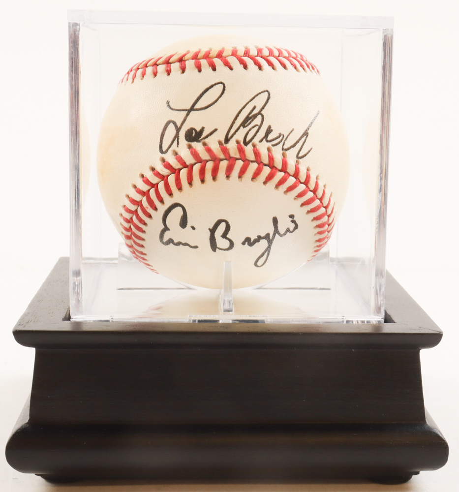 Rawlings Official National League baseball. Hand-signed by Lou Brock (D. 2020, St. Louis Cardinals, HOF) and Ernie Broglio (D. 2019). Display case included as shown.