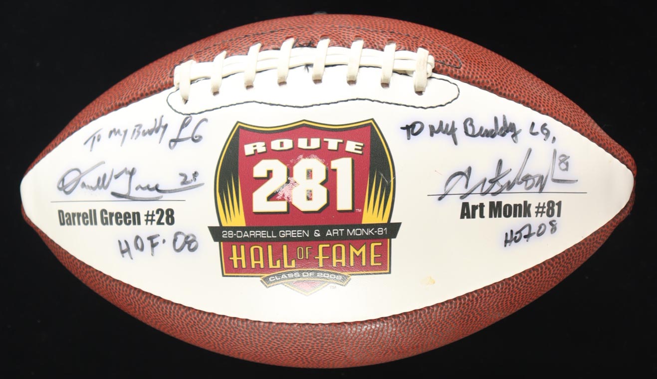 2008 Hall of Fame Logo NFL Football has been hand-signed and inscribed by Art Monk (Washington Redskins, HOF) and Darrell Green (Washington Redskins, HOF).
