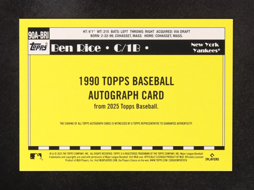 Ben Rice 2025 Topps Auto #90A-BRI RC