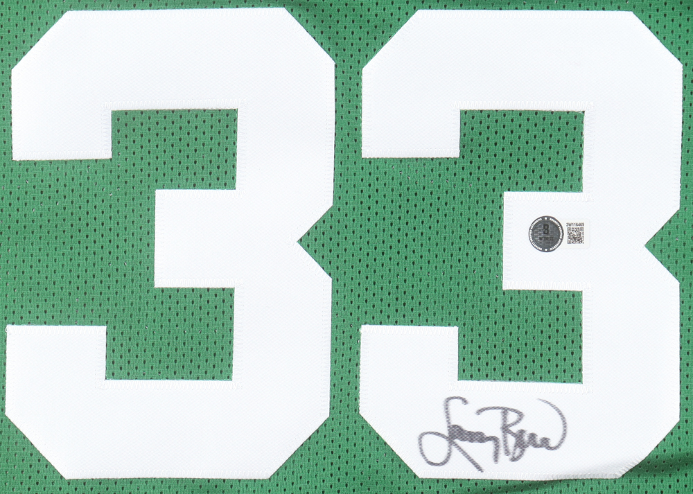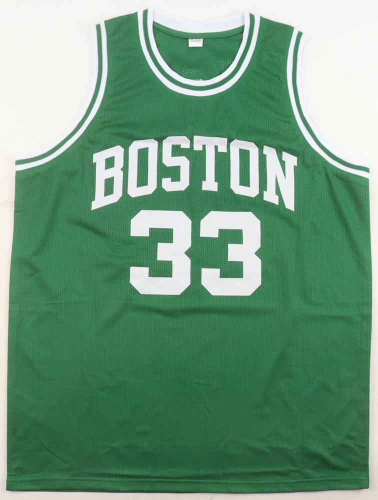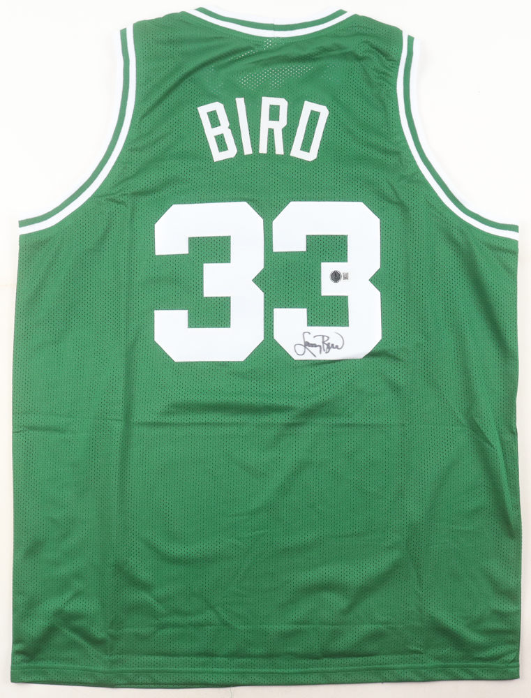 Custom jersey with everything sewn on, size XL. Hand-signed by Larry Bird (HOF). Please note, the signature has bled.