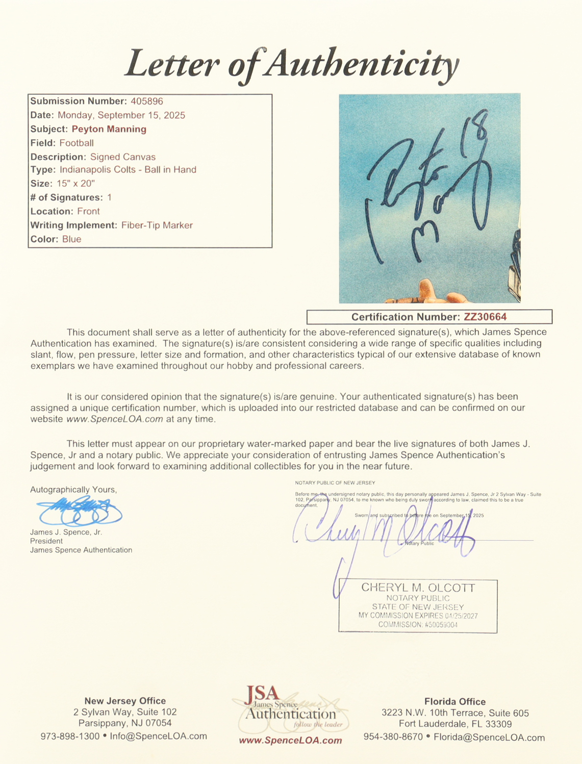 Piece measures 15" x 20" in size. Hand-signed by Peyton Manning (Indianapolis Colts, HOF) and the artist, Gary Longordo.
