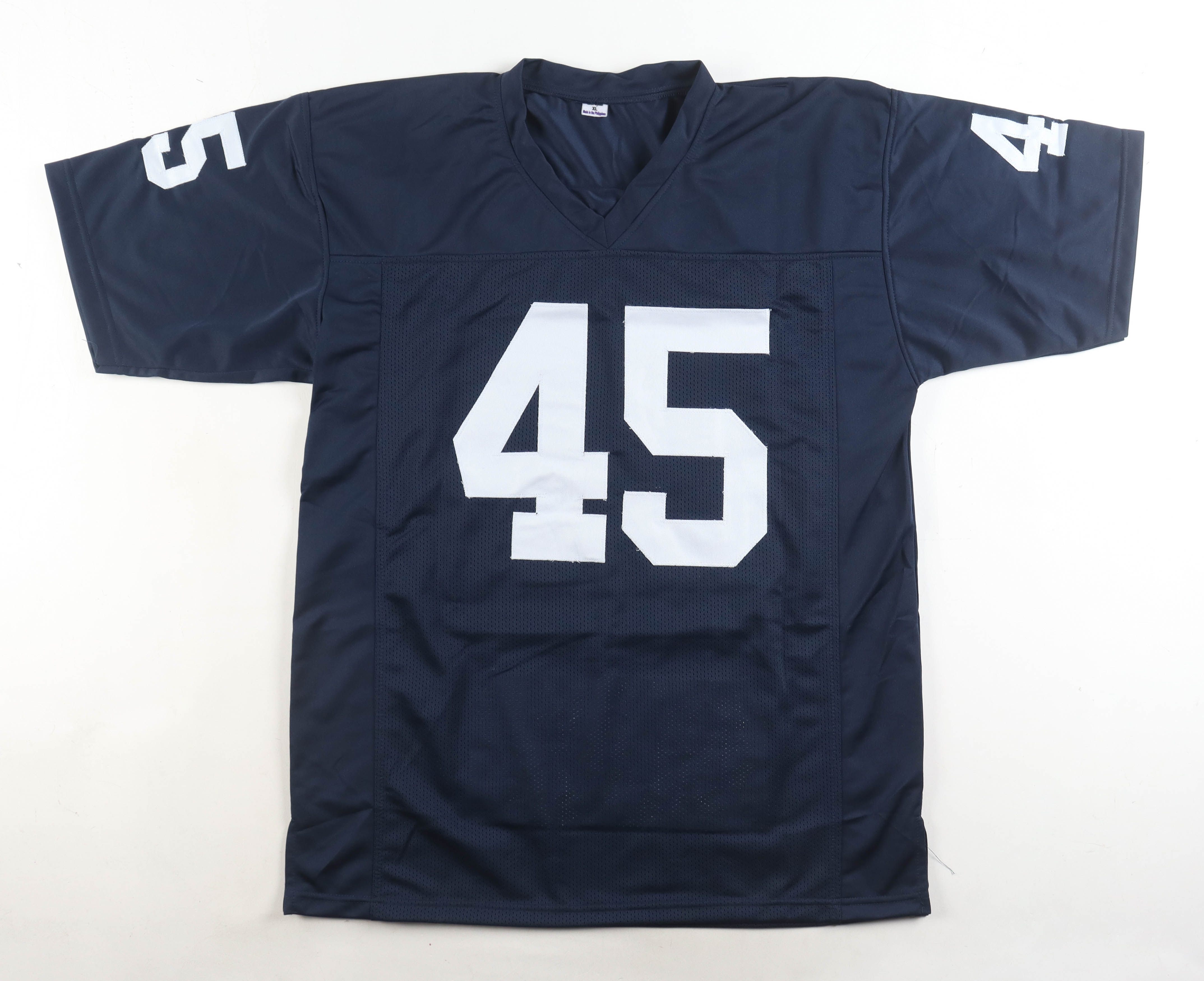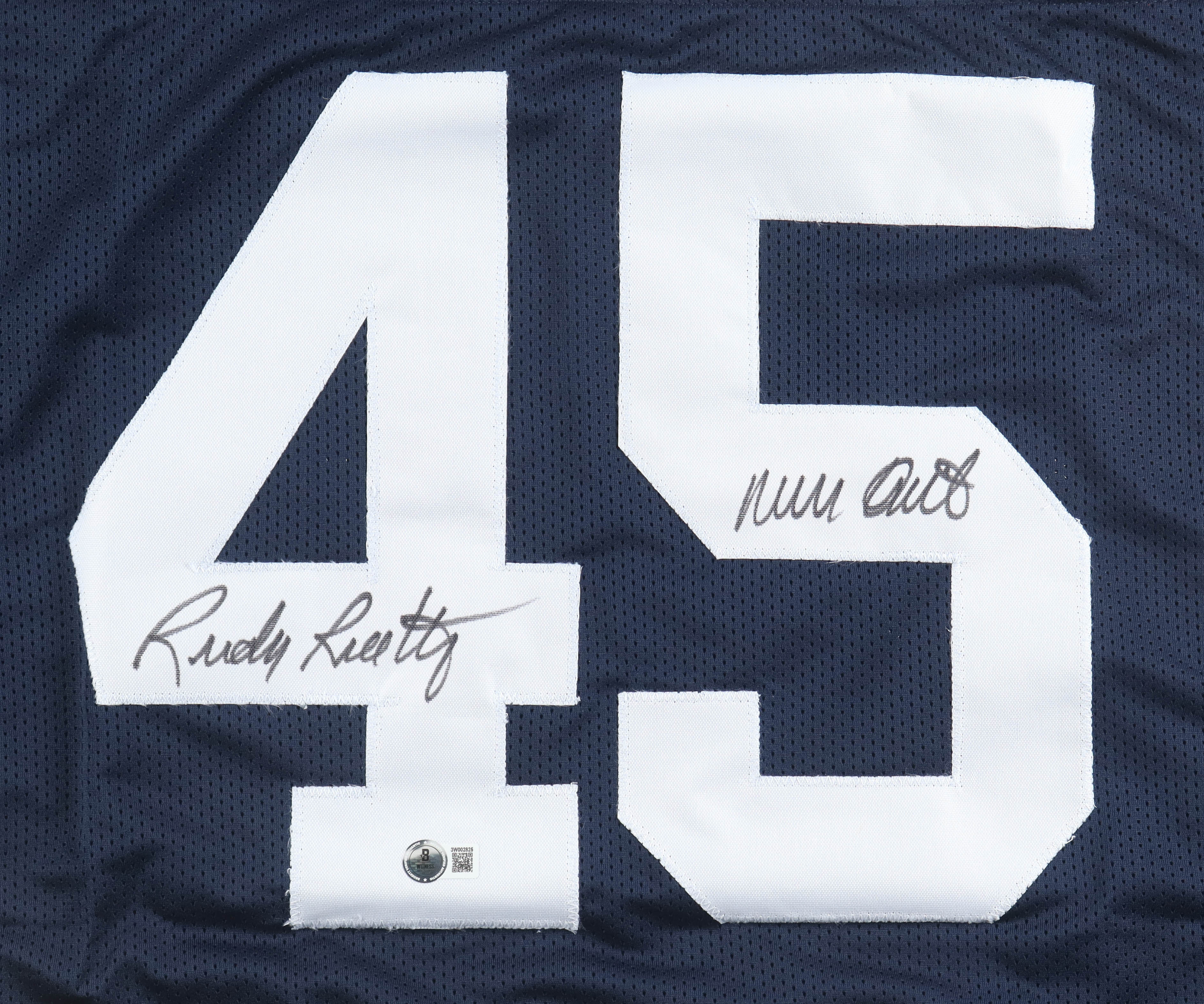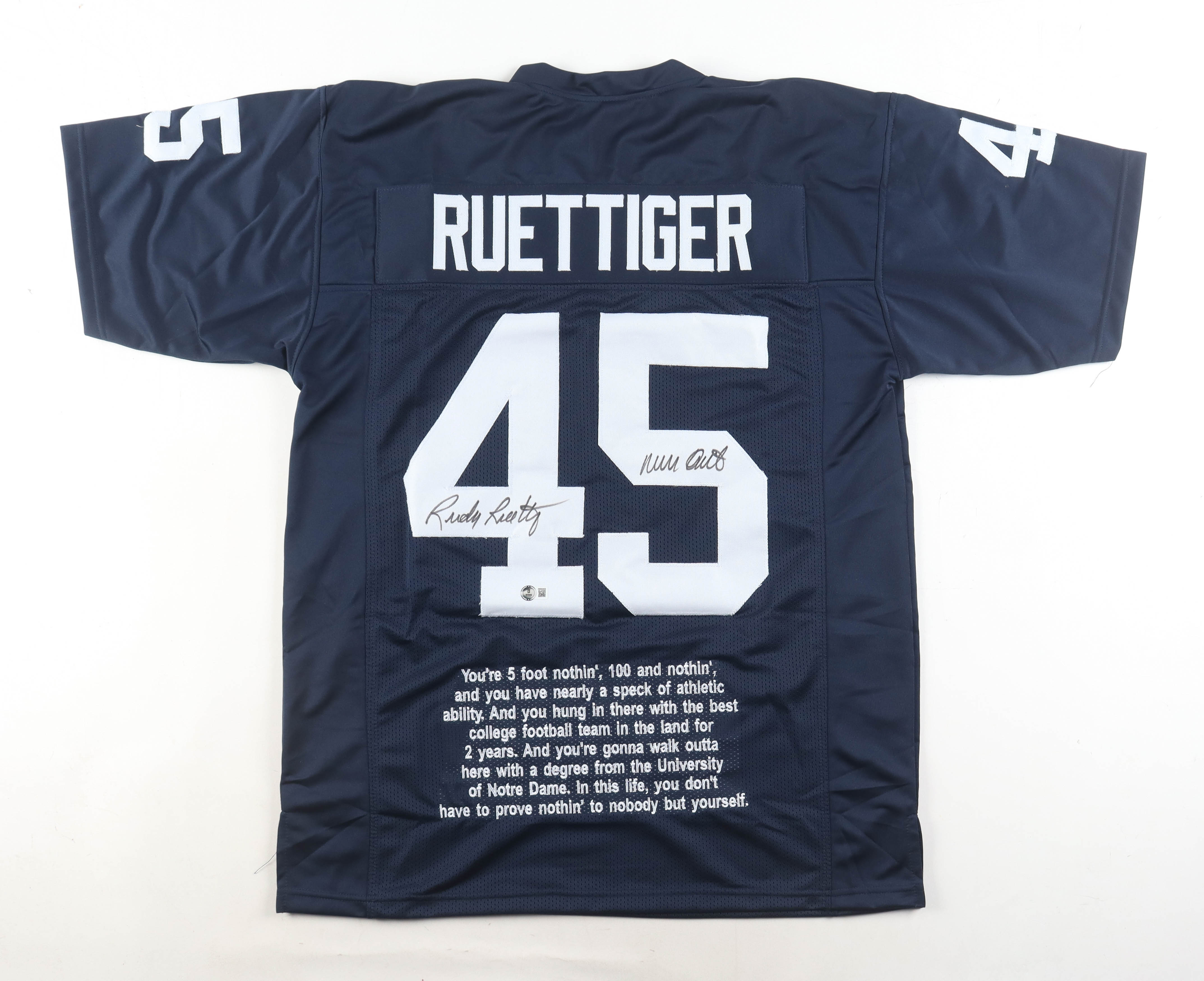 Custom jersey with everything sewn on, size XL. Hand-signed and inscribed by Rudy Ruettiger (Notre Dame Fighting Irish). Please note, a quote from the movie "Rudy" has been custom-stitched below the reverse numbers.