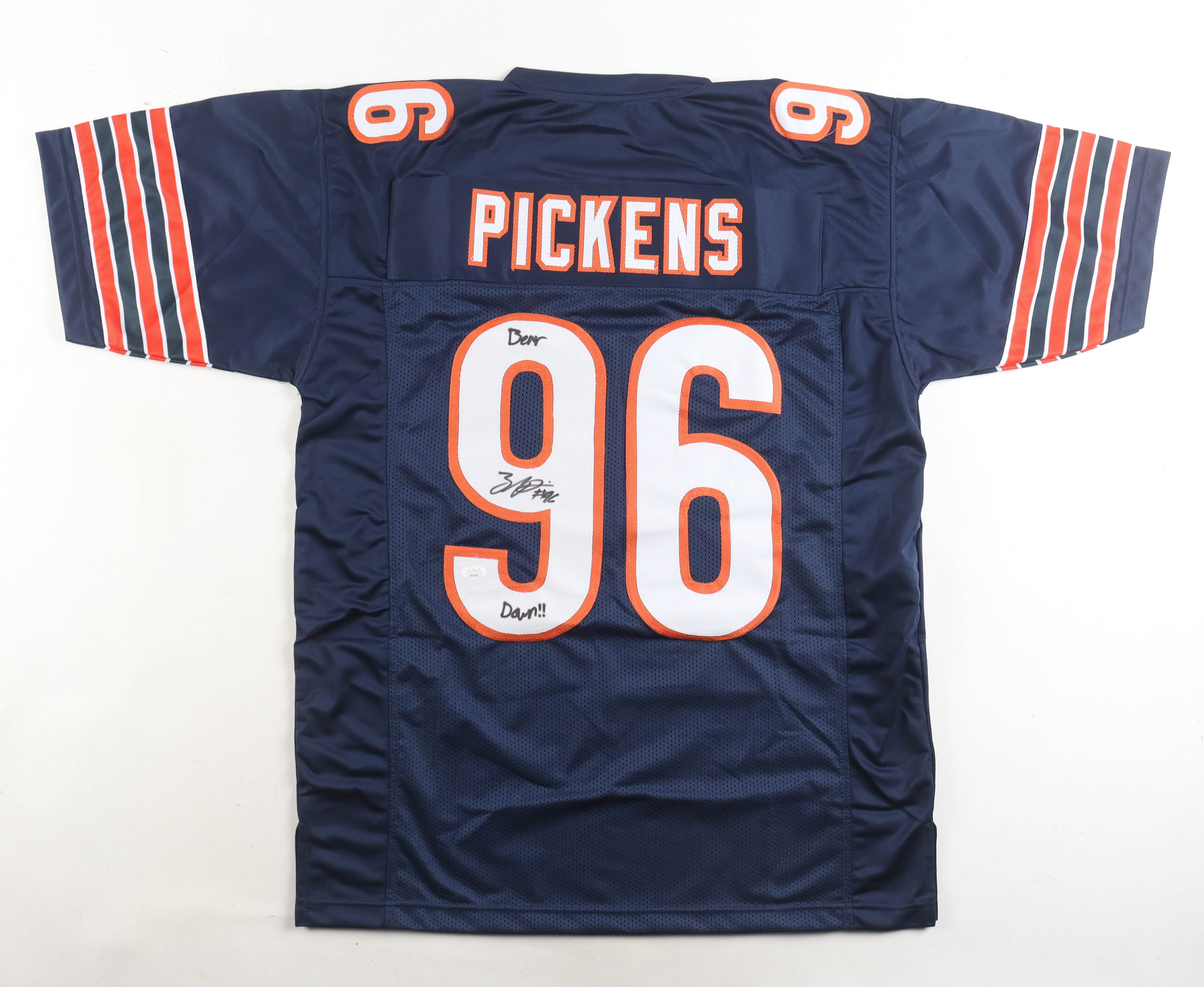Custom jersey with everything sewn on, size XL. Hand-signed and inscribed by Zacch Pickens. Please note, the inscription has bled. See photos regarding the condition of the item.