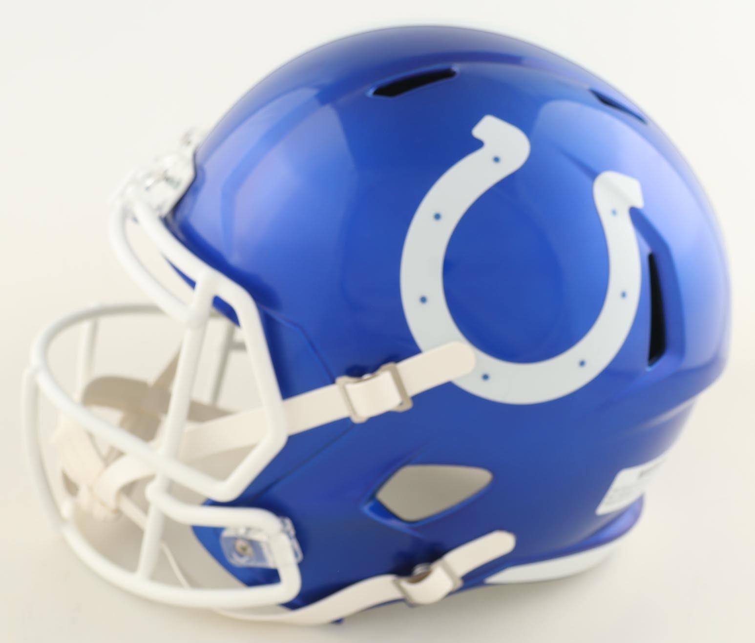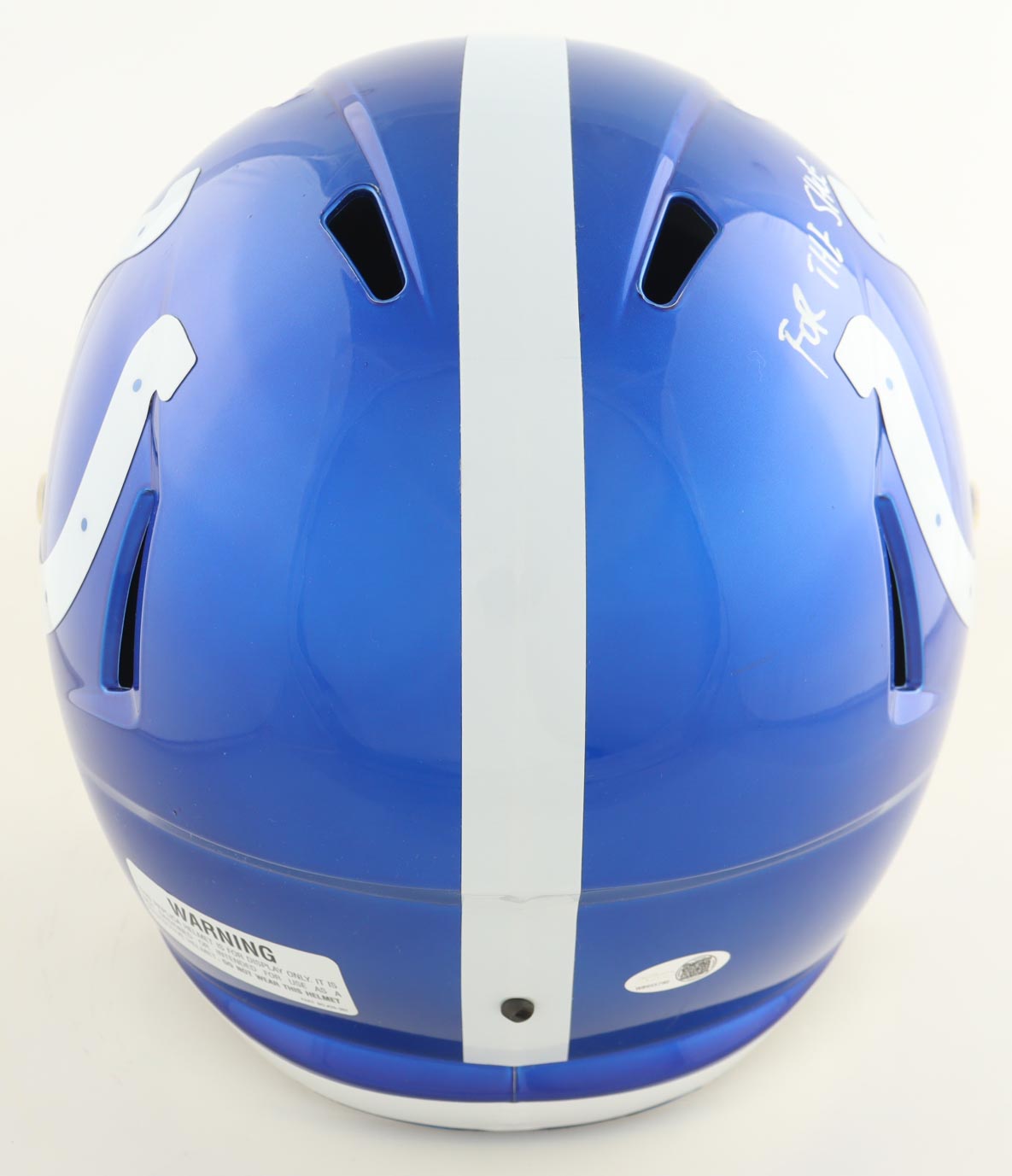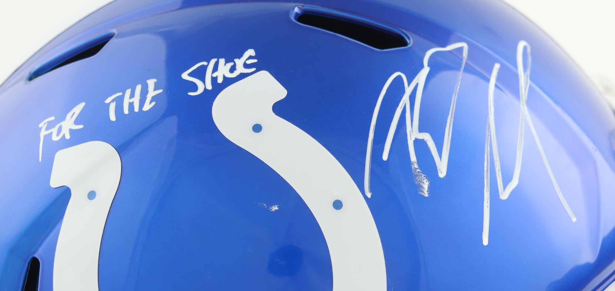 Riddell Indianapolis Colts full-size flash alternate speed replica helmet has been hand-signed and inscribed by Riley Leonard.