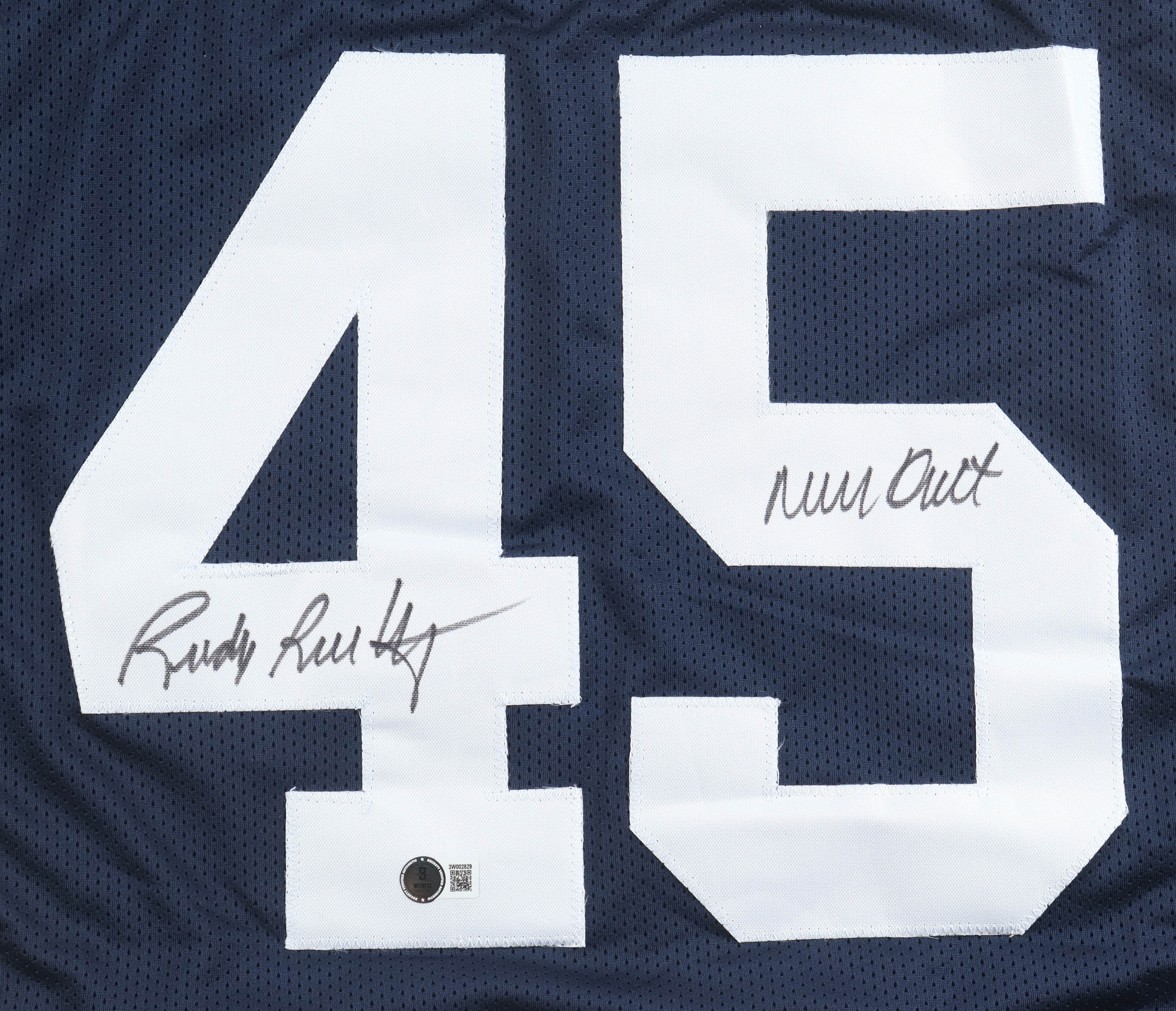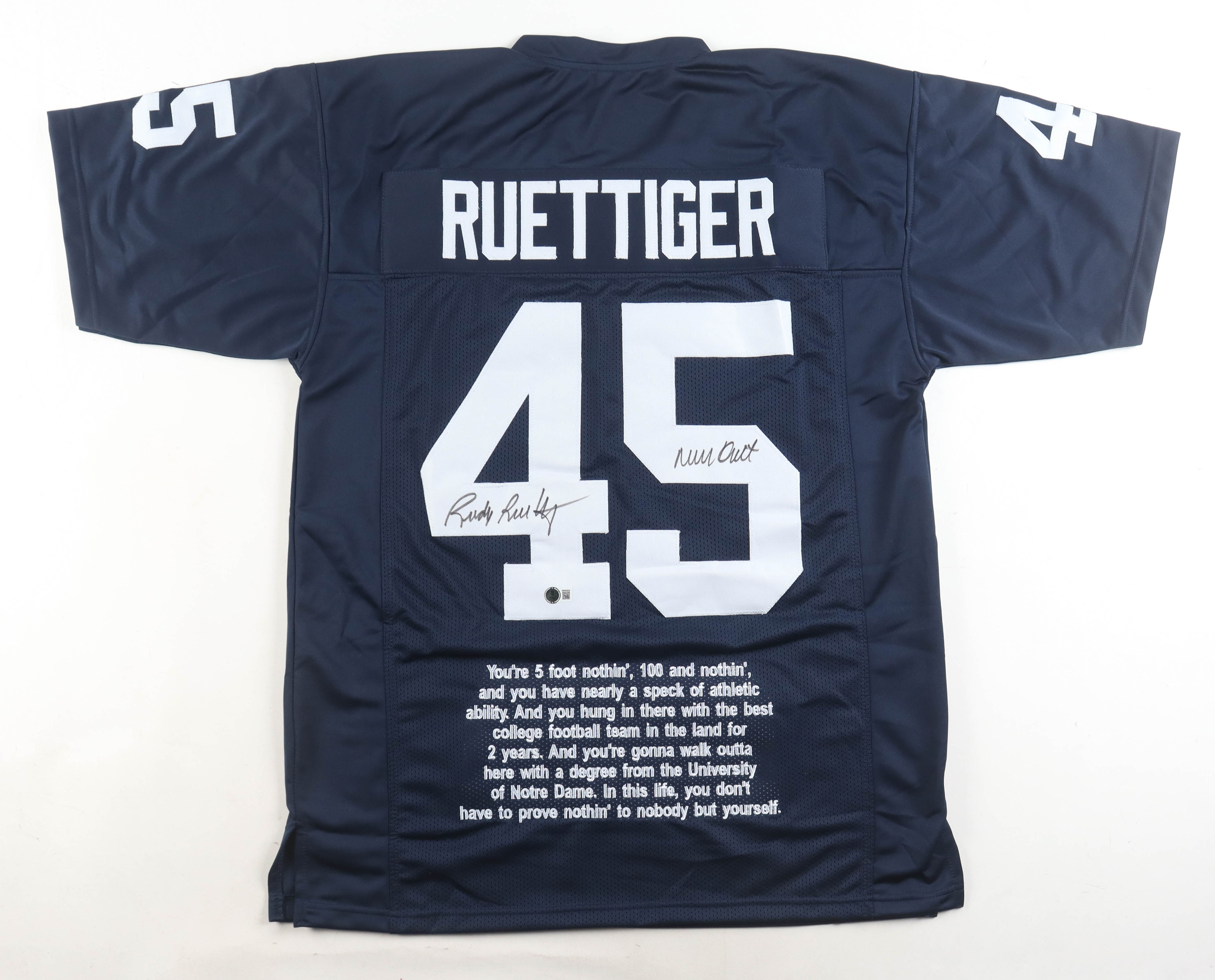 Custom jersey with everything sewn on, size XL. Hand-signed and inscribed by Rudy Ruettiger (Notre Dame Fighting Irish). Please note, a quote from the movie "Rudy" has been custom-stitched below the reverse numbers.