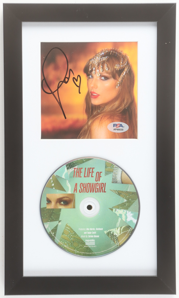 Custom frame measures approximately 8" x 13.5" in size. Features a "The Life Of A Showgirl" record album insert that has been hand-signed by Taylor Swift. The display also includes the disc.
