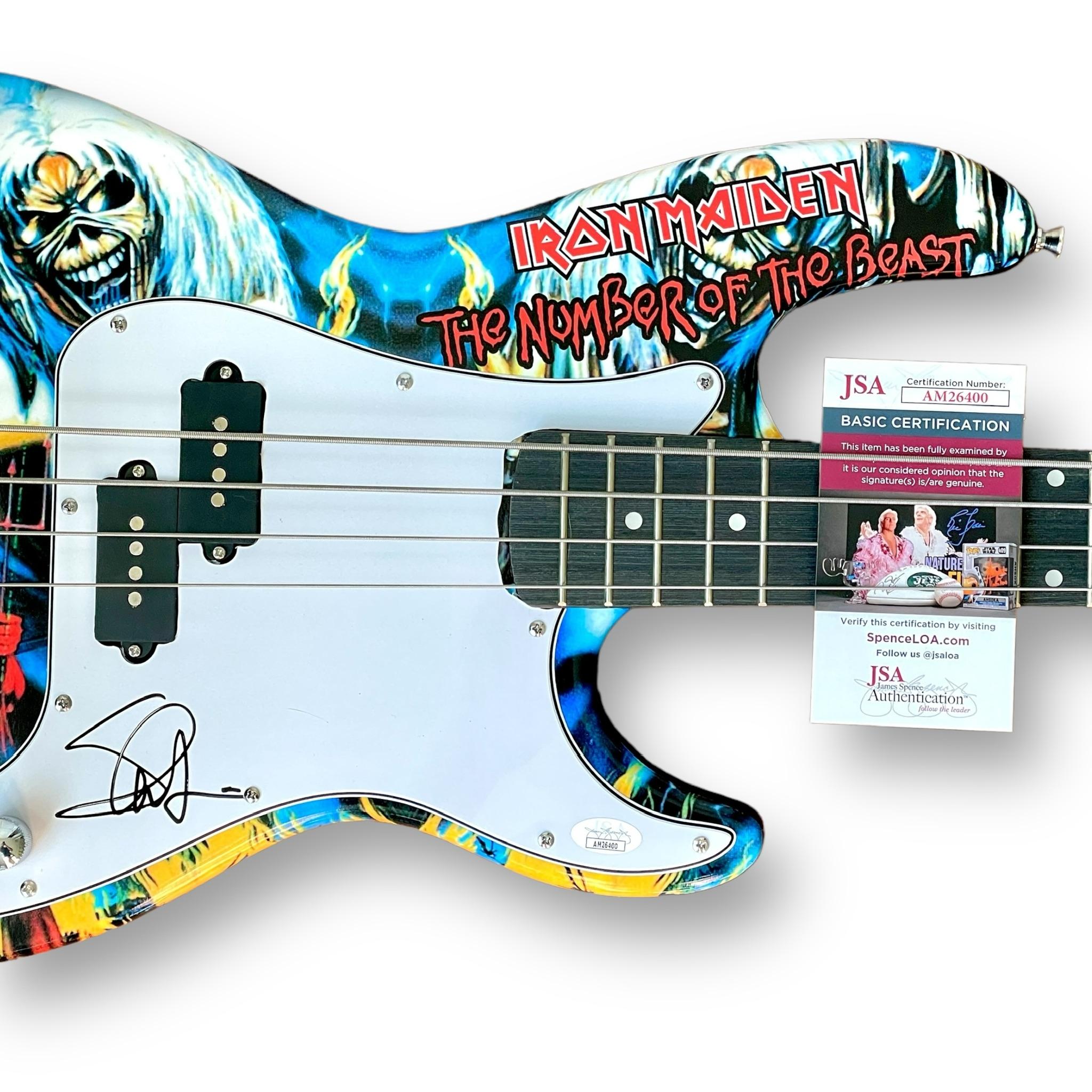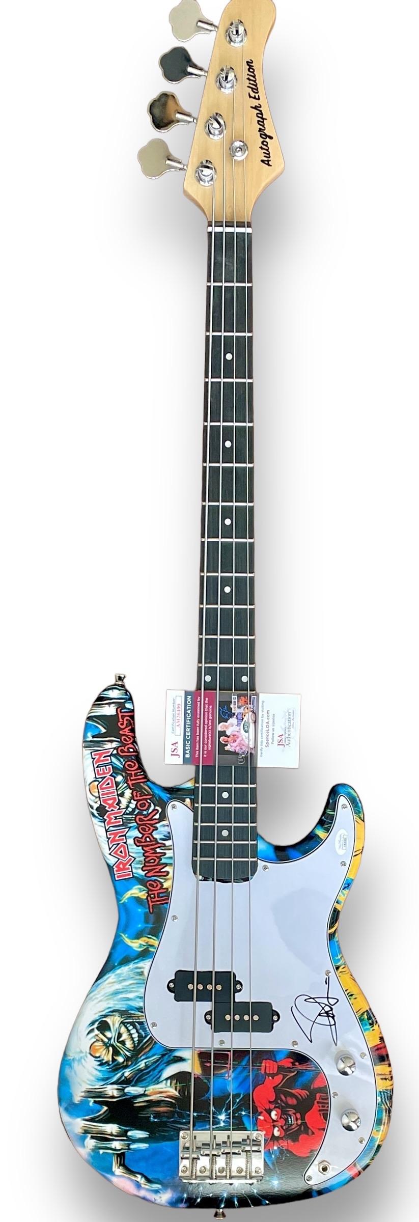 Custom Autograph Edition P-Bass electric guitar measures approximately 39" in length and has been hand-signed on the pickguard by Steve Harris (lead bassist).