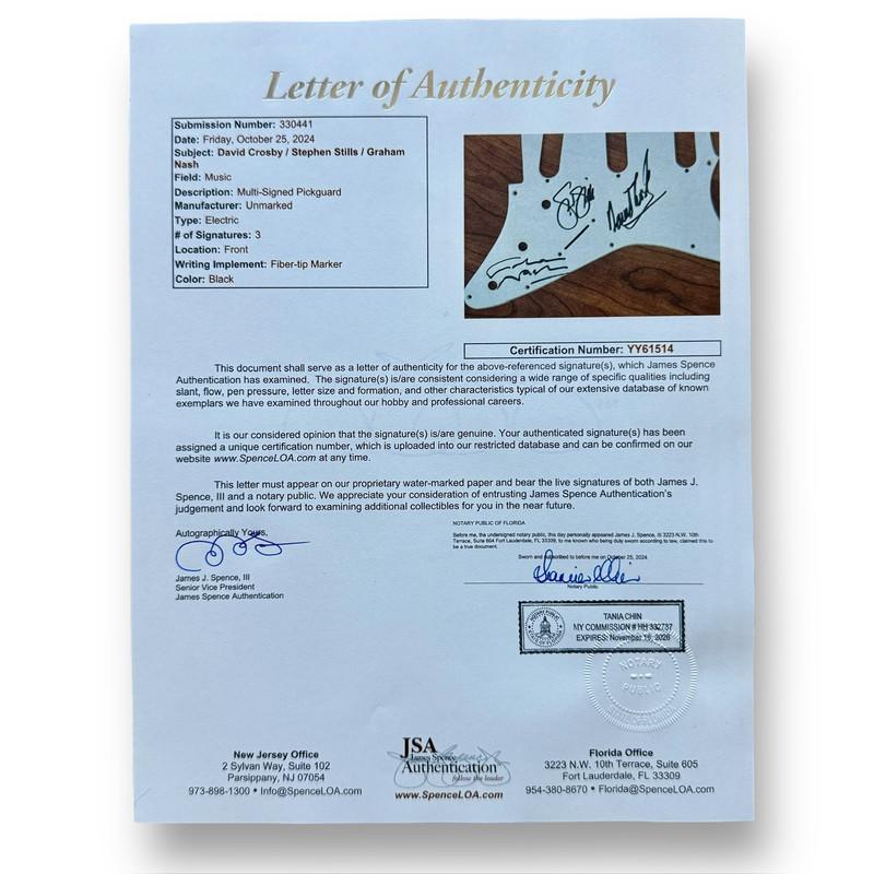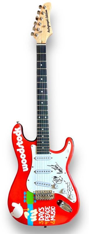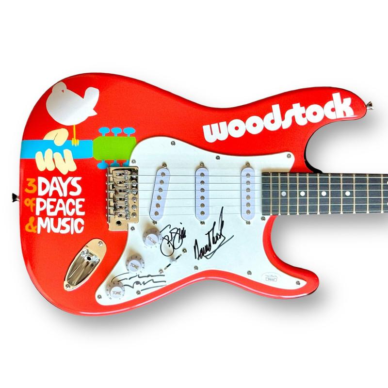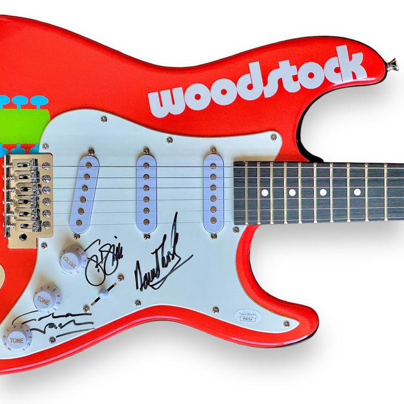 Custom Autograph Edition Crosby, Stills, and Nash: Woodstock Stratocaster style electric guitar measures approximately 39" in length and has been hand-signed on the pickguard by David Crosby, Stephen Stills, and Graham Nash.