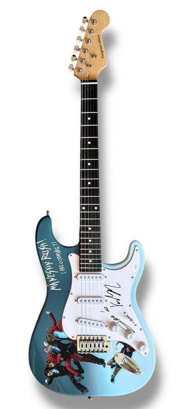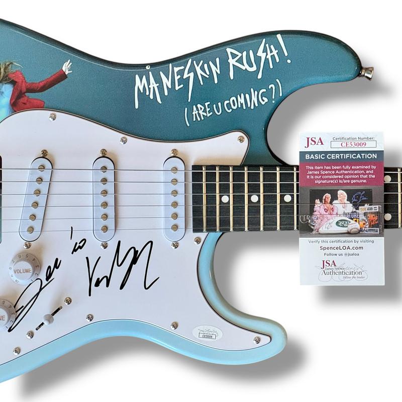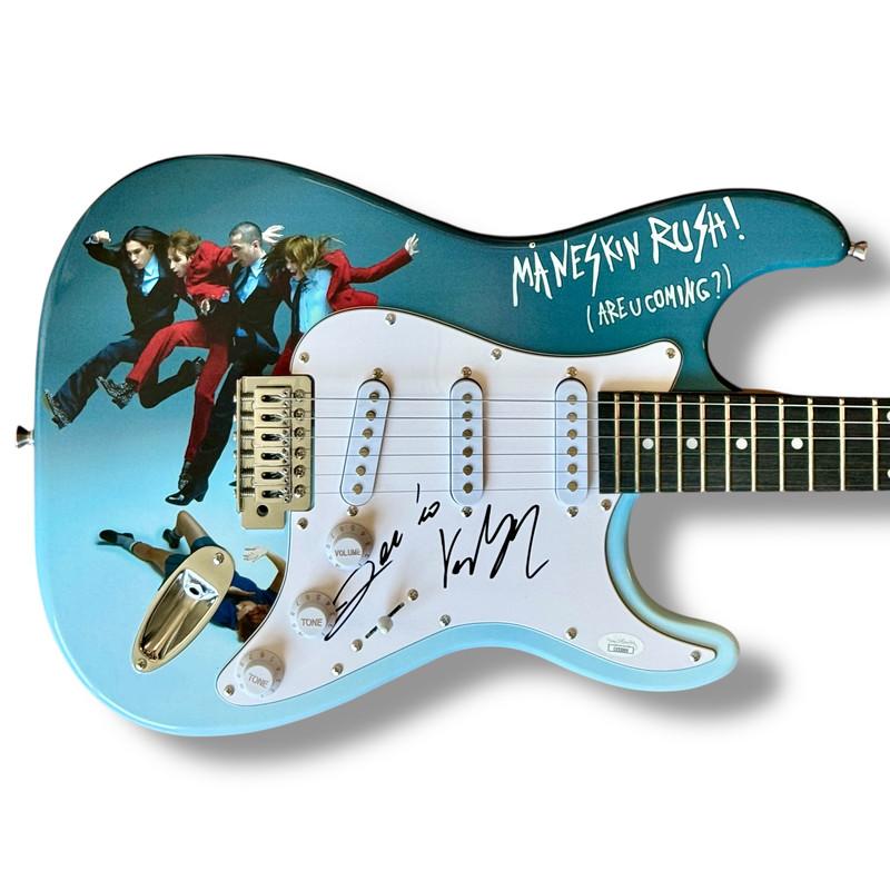 Custom Autograph Edition Stratocaster style electric guitar measures approximately 39" in length and has been hand-signed on the pickguard by Damiano David (Lead Singer) and Victoria De Aneglis (Lead Bassist).
