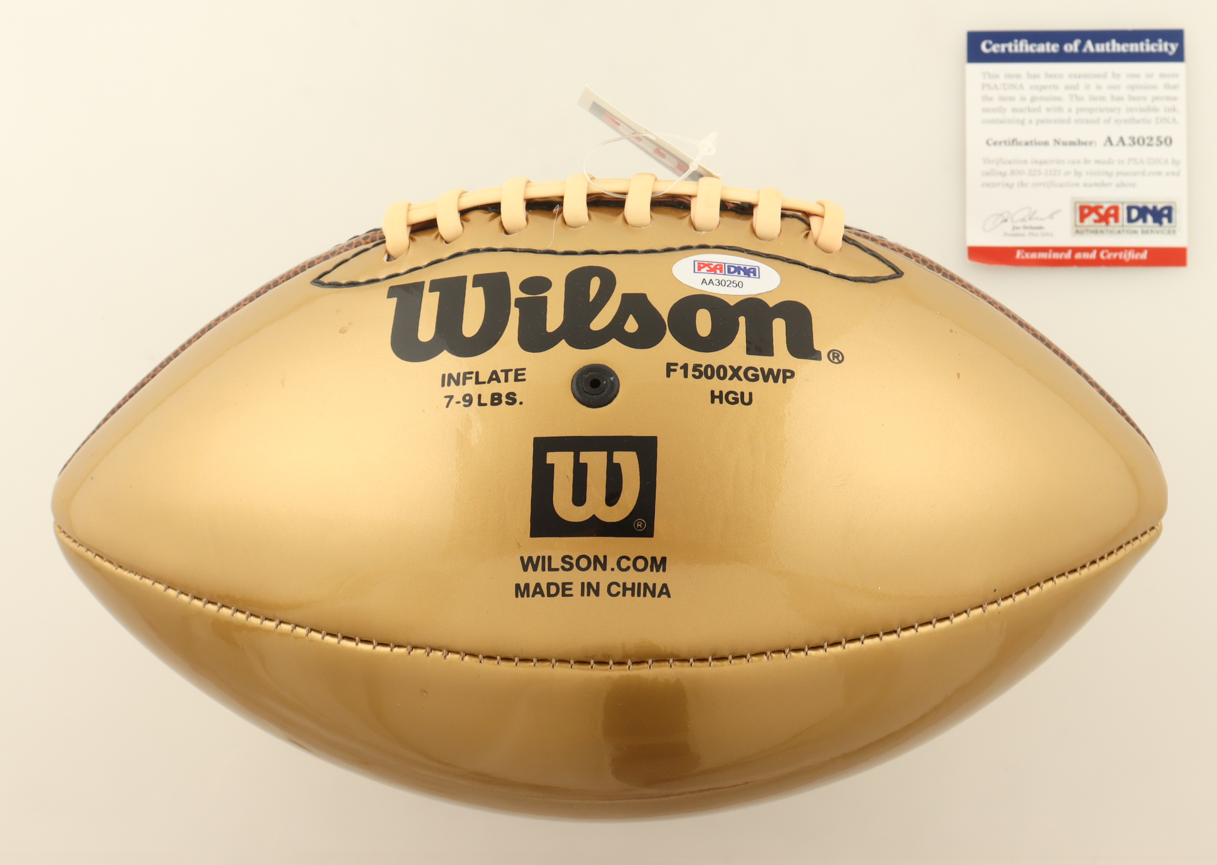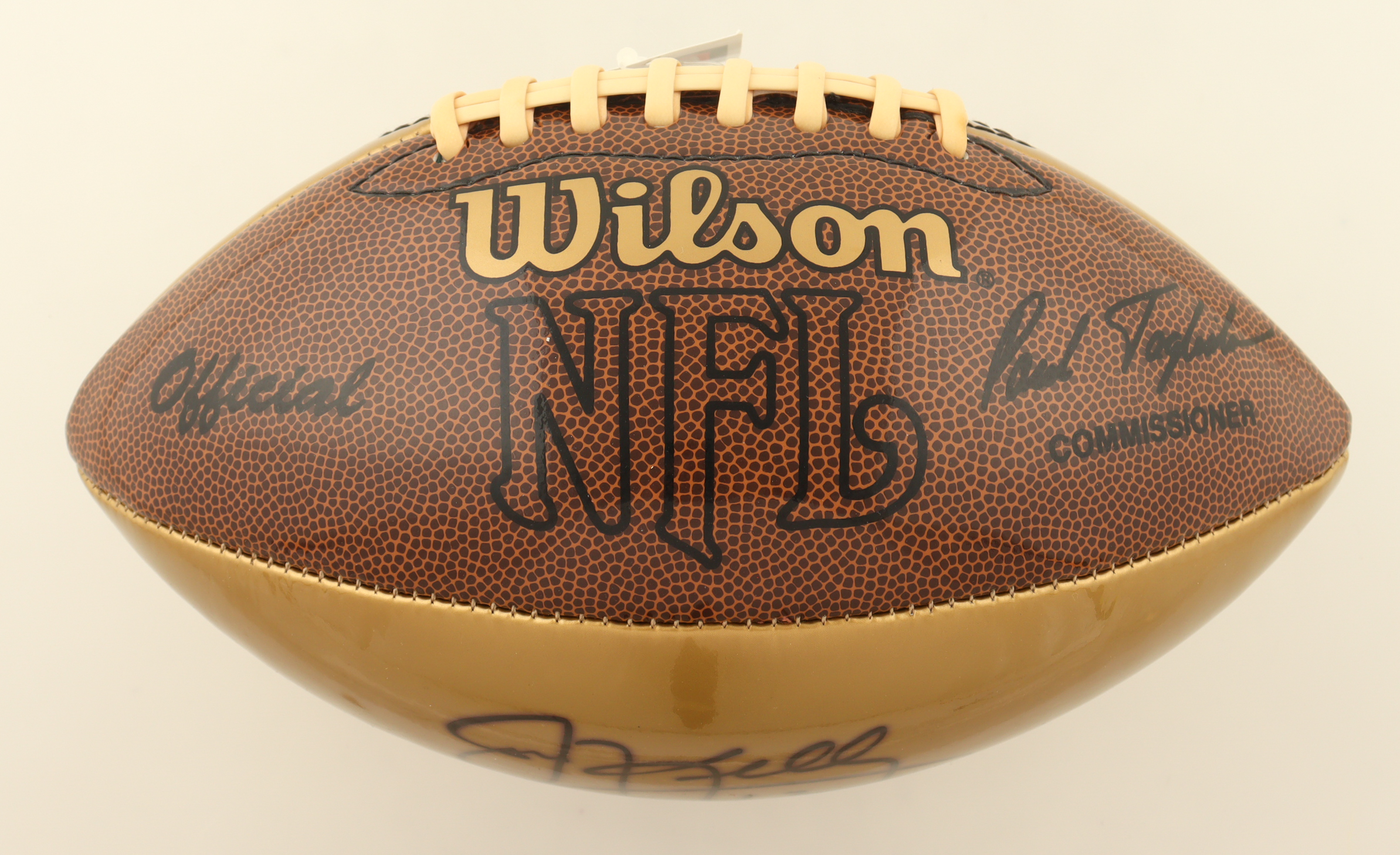 Wilson Signature Edition gold panel full-size NFL football. Hand-signed by Jim Kelly (Buffalo Bills).