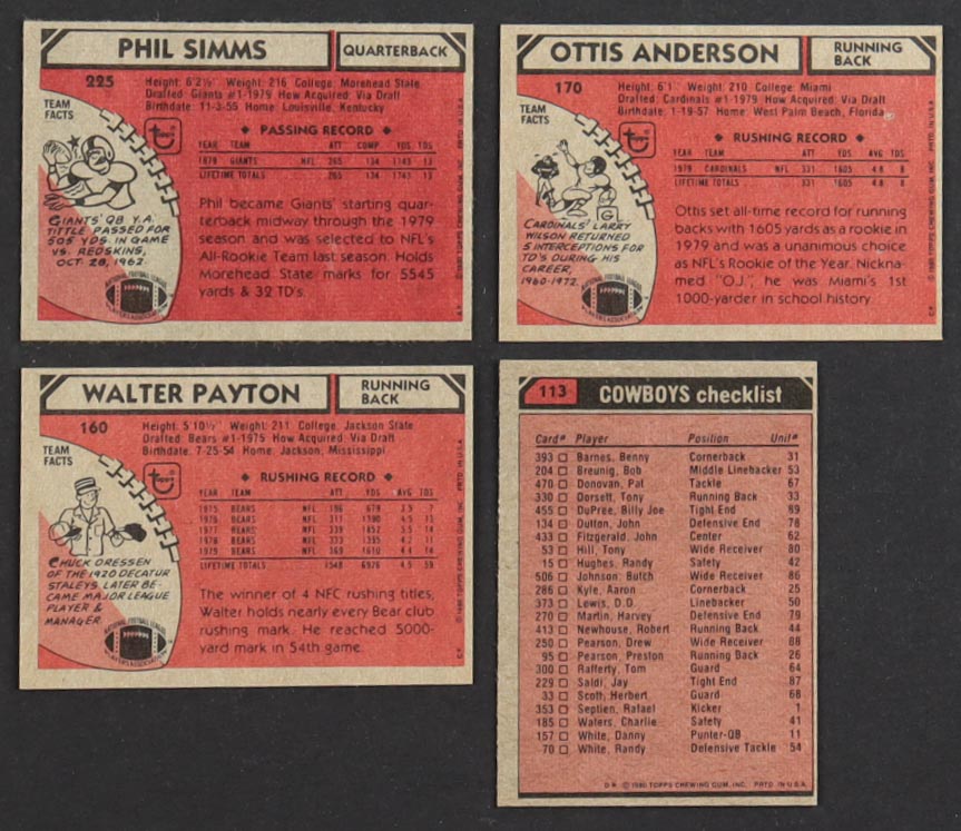 1980 Topps Football Complete Set Of (528) Cards With Phil Simms #225, Ottis Anderson #170, Walter Payton #160
