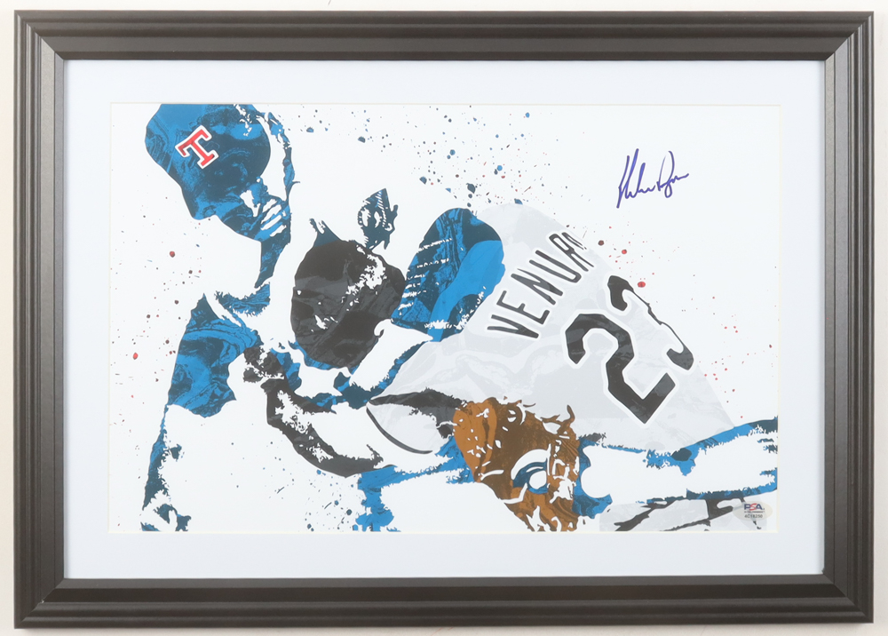 Custom frame measures 15" x 21" in size, featuring an art print, hand-signed by Nolan Ryan (Texas Rangers, HOF). Please see photos regarding the condition of the item.