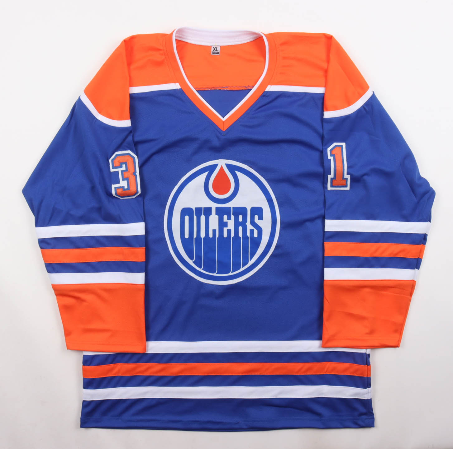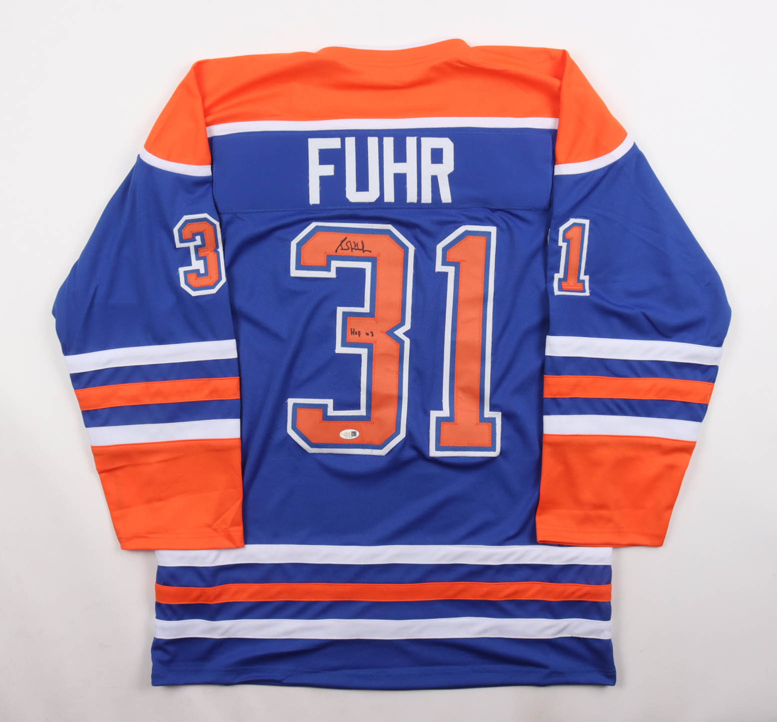 Custom jersey with everything sewn on, size XL. Has been hand-signed and inscribed by Grant Fuhr (HOF).