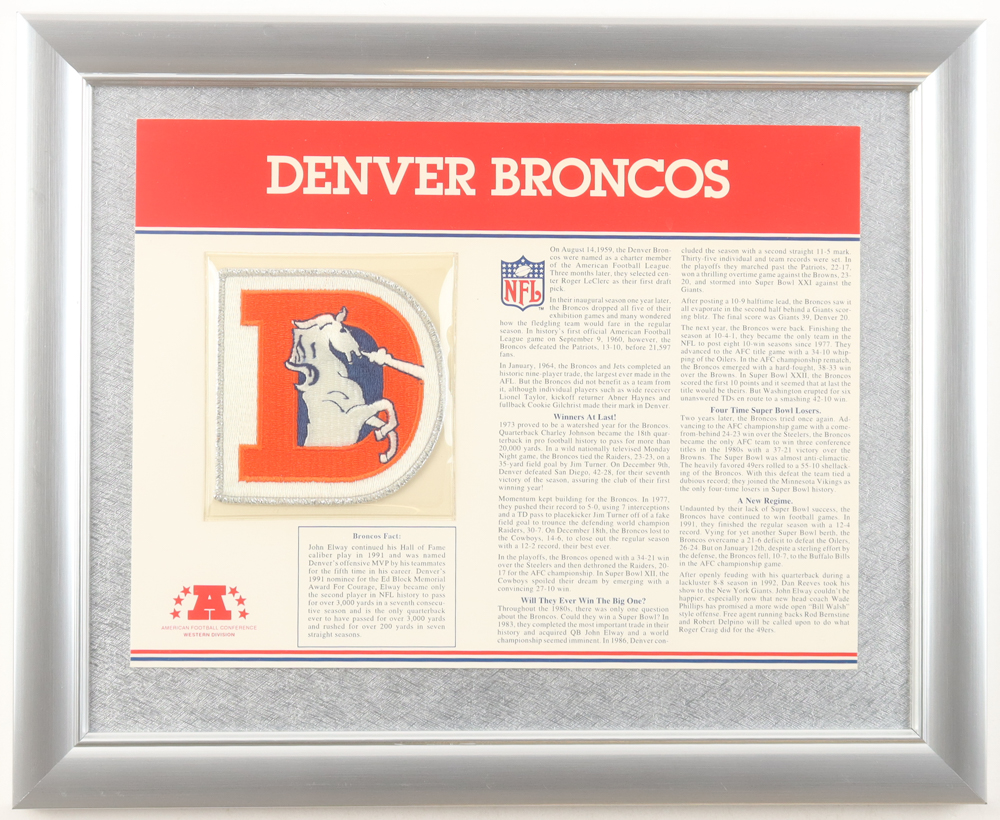 Custom frame measures approximately 13" x 16" in size. The display features a Denver Broncos Commemorative Stat and Patch Card. Please note that the item is unsigned.