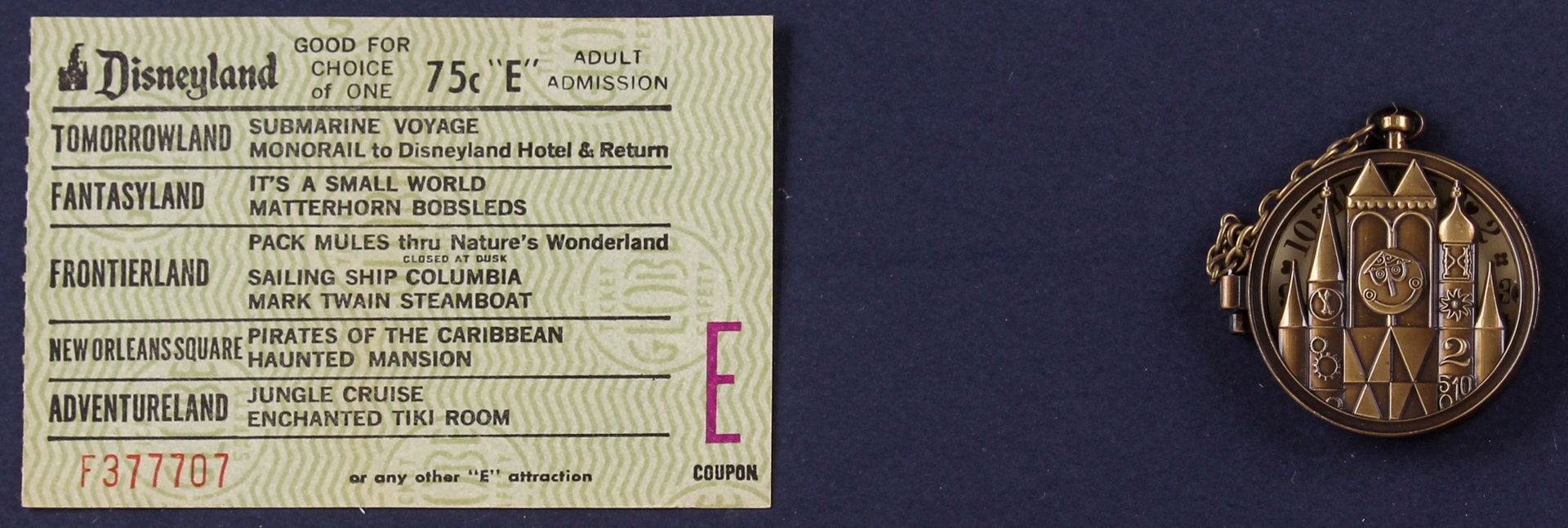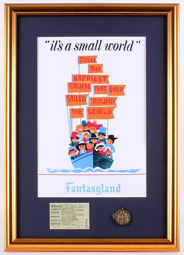 Vintage Disneyland "It's A Small World" 17.25x24.25 Custom Framed Park Guide Display with Vintage Ticket & Bronze Pocket Watch