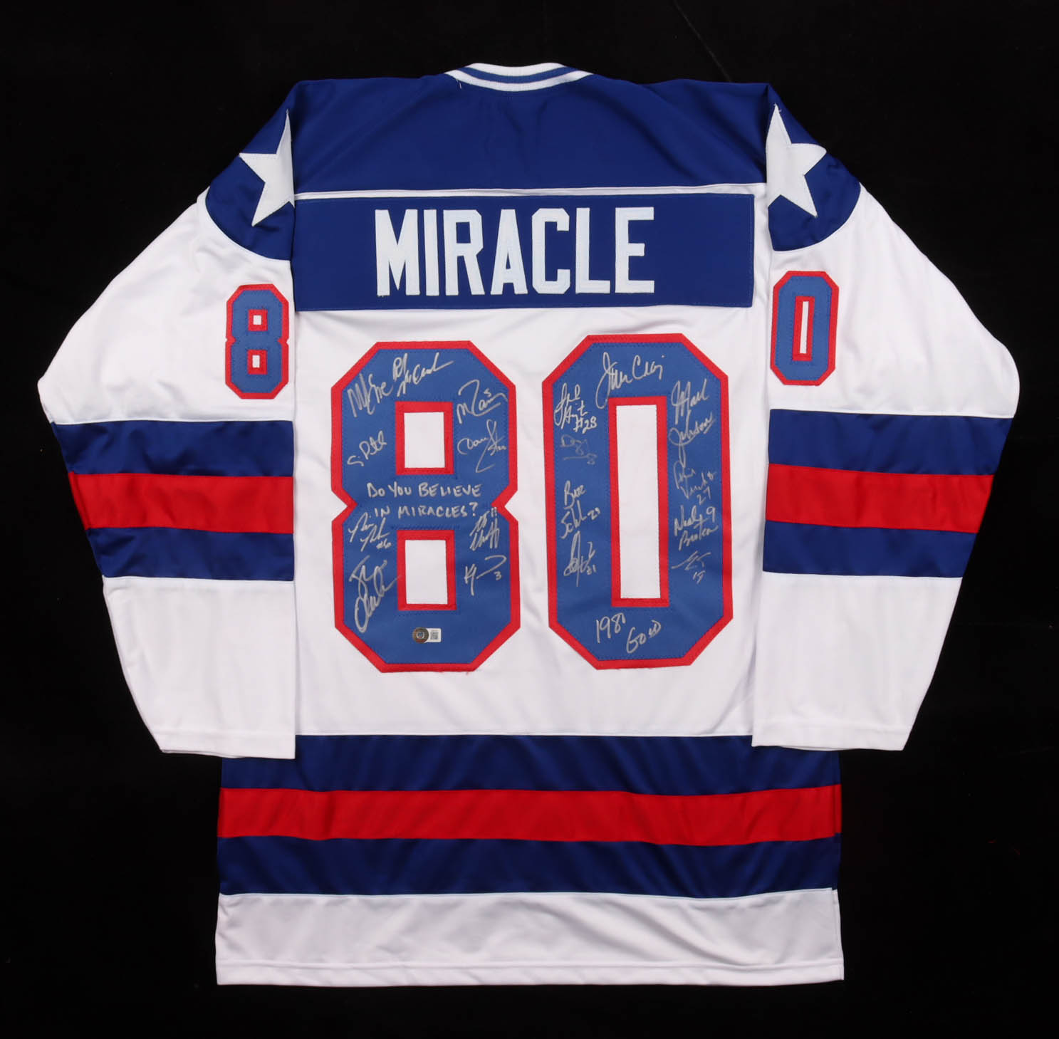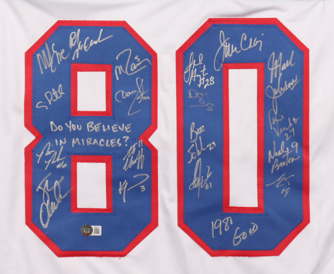 1980 Team USA | "Miracle on Ice" | Jersey Signed by (18) with Mike Eruzione, Jim Craig, Mark Johnson, Neal Broten Inscribed "Do you Believe in Miracles?" & "1980 Gold" (Beckett)
