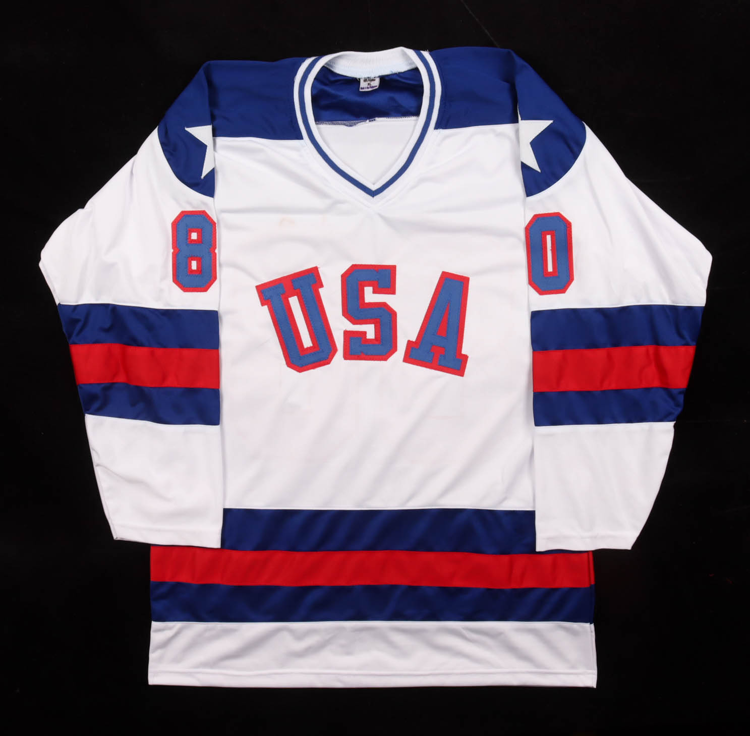 Custom jersey with everything sewn on, size XL. Hand-signed & inscribed by (18) with Rob McClanahan, Bill Baker, Neal Broten, Dave Christian, Steve Christoff, Mike Eruzione, Steve Janaszak, Mark Johnson, Ken Morrow, Dave Silk, John O'Callahan, Mike Ramsey, William "Buzz" Schneider, Eric Strobel, Phil Verchota, Craig Patrick, John Harrington, and Jim Craig. Please note, there is staining on the front of the jersey. See photos regarding the condition of the item.