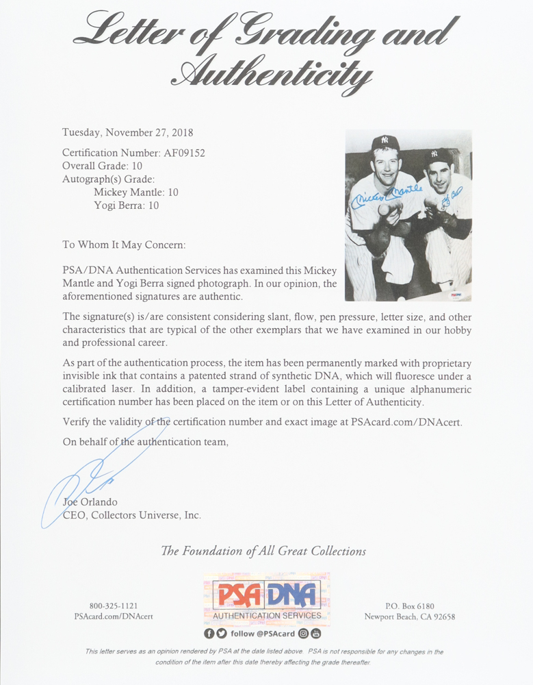 The photo has been authenticated and encapsulated with an LOA by PSA/DNA for authenticity purposes. The autographs (2) have all been graded Gem Mint 10 by PSA.