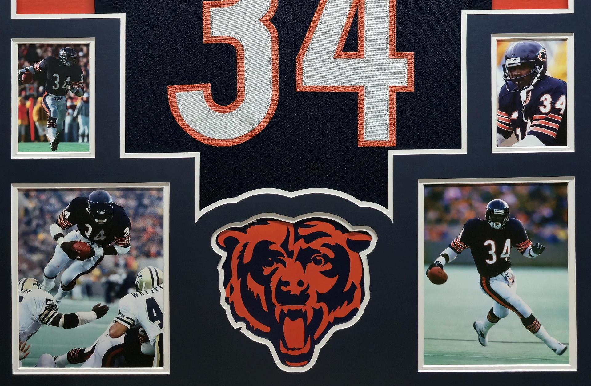 Custom frame measures 34" x 42" in size and features an unsigned jersey of Walter Payton. See photos for condition of the frame.