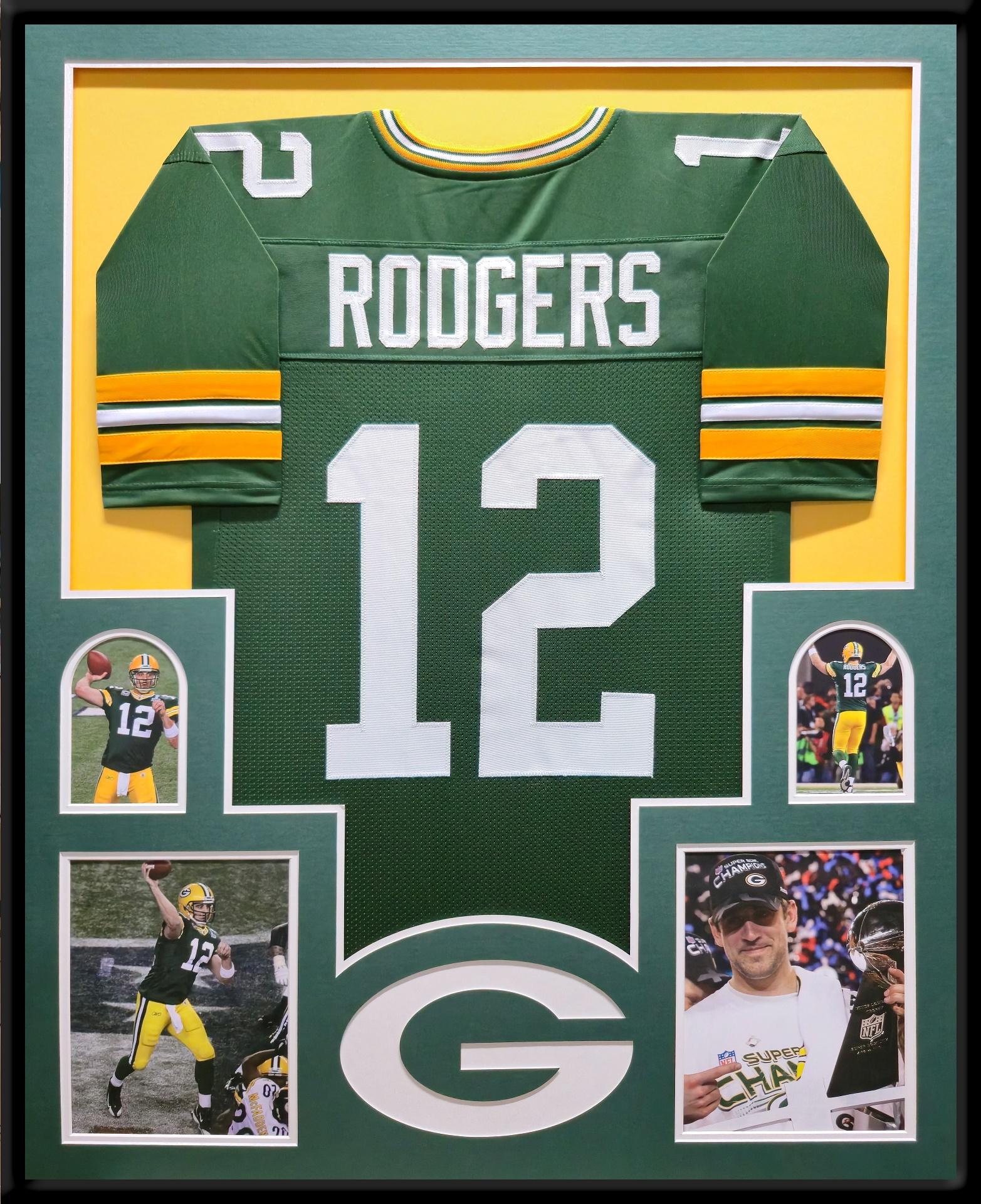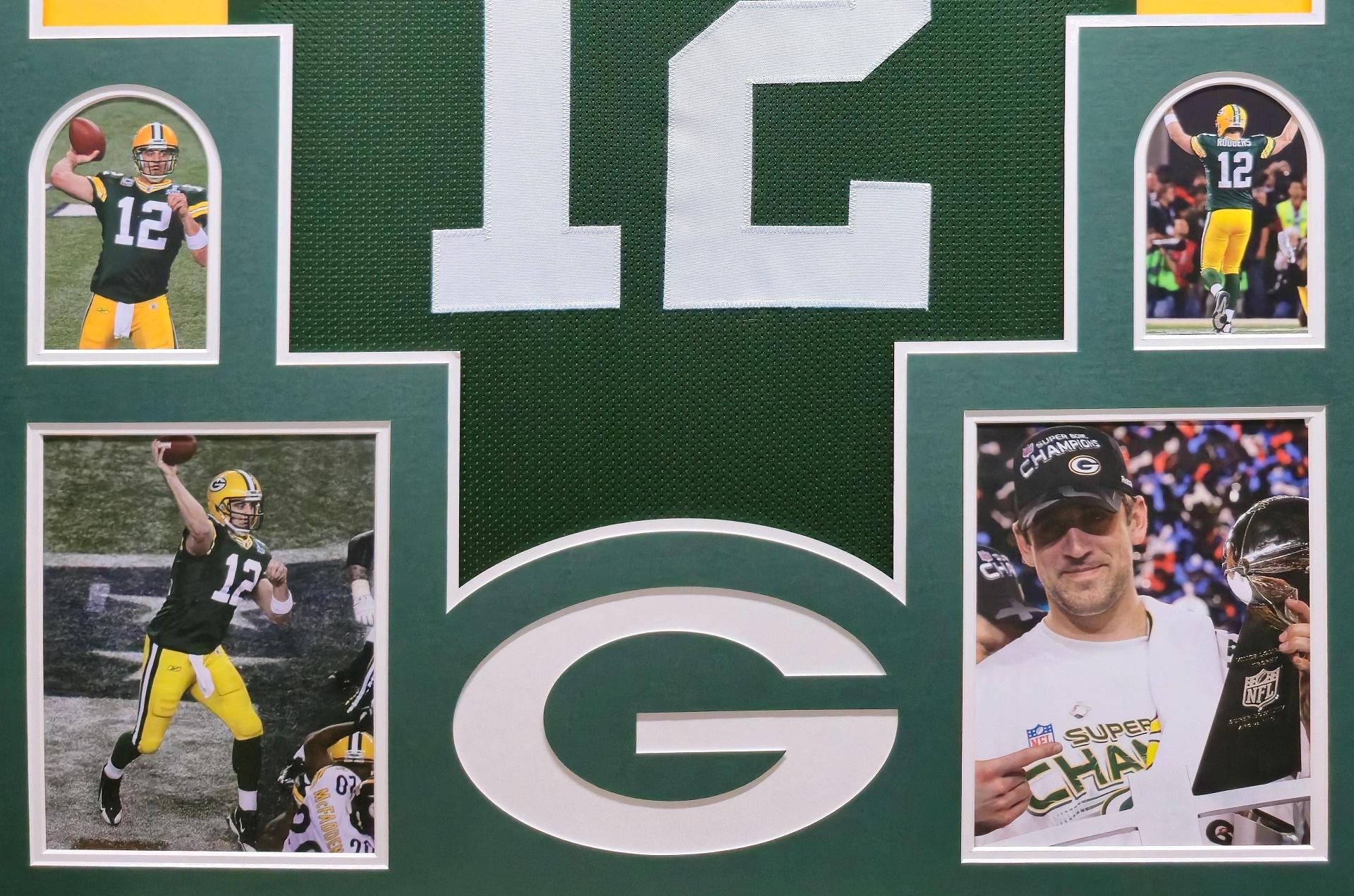 Custom frame measures 34" x 42" in size and features an unsigned jersey of Aaron Rodgers. See photos for condition of the frame.
