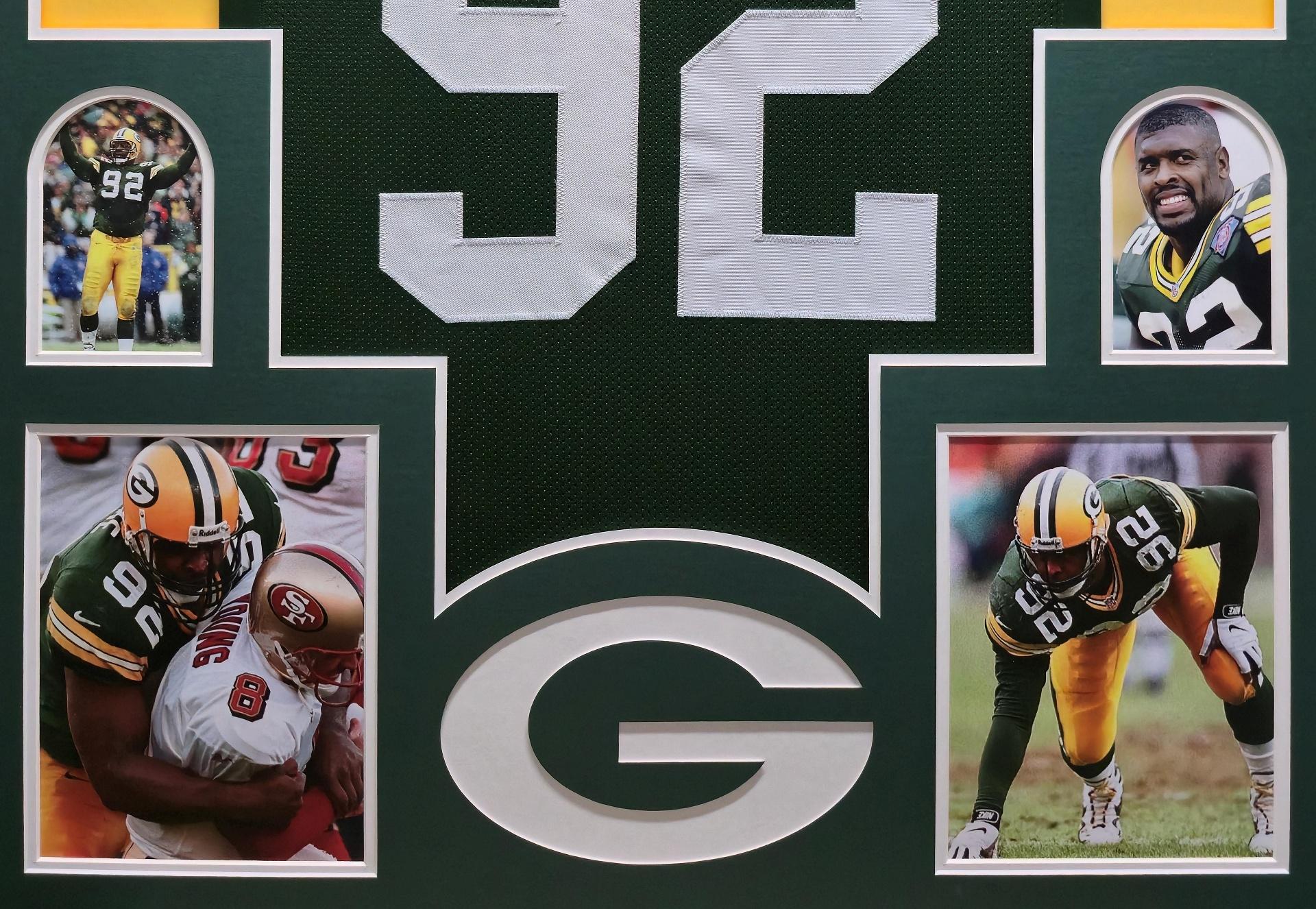 Custom frame measures 34" x 42" in size and features an unsigned jersey of Reggie White. See photos for condition of the frame.