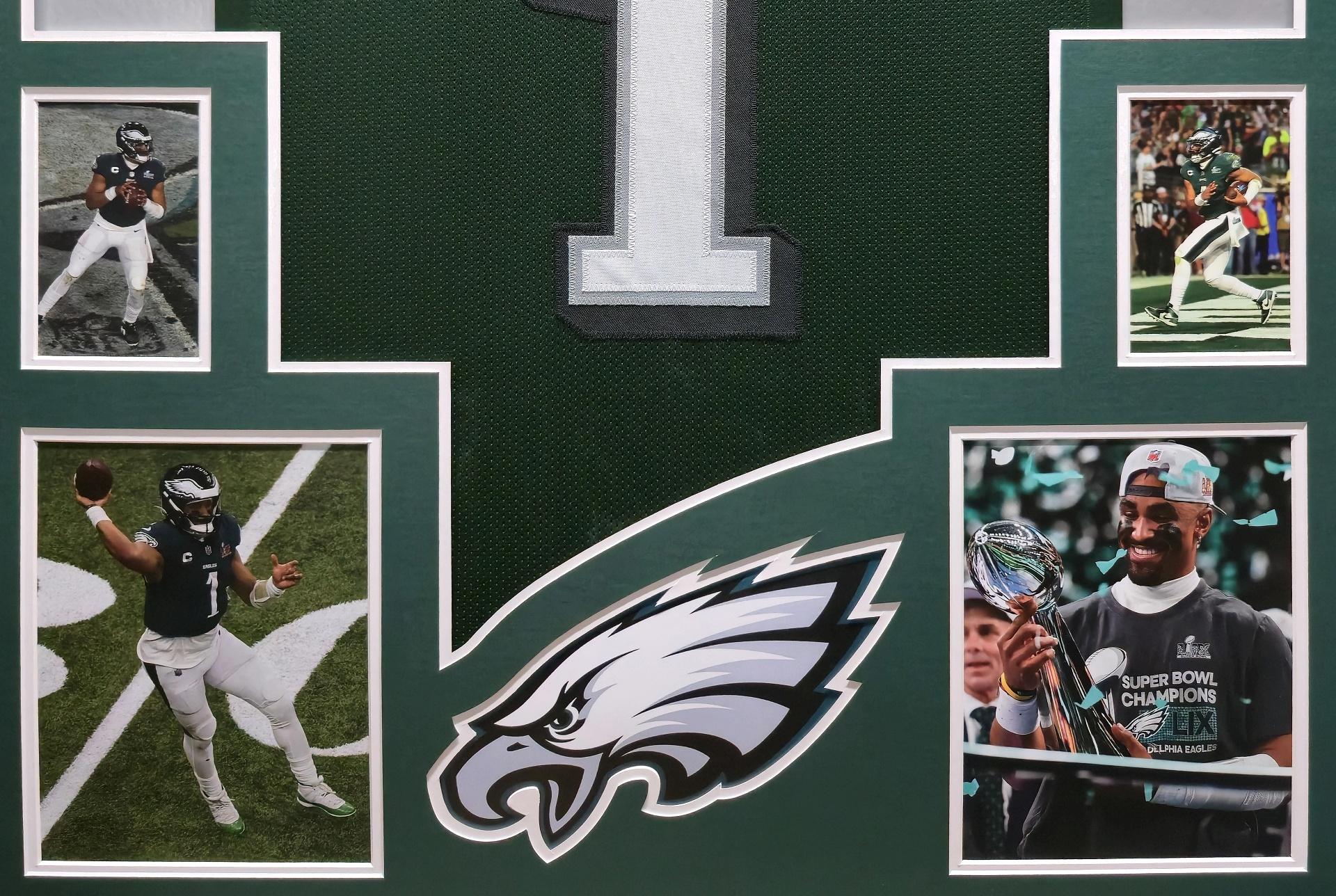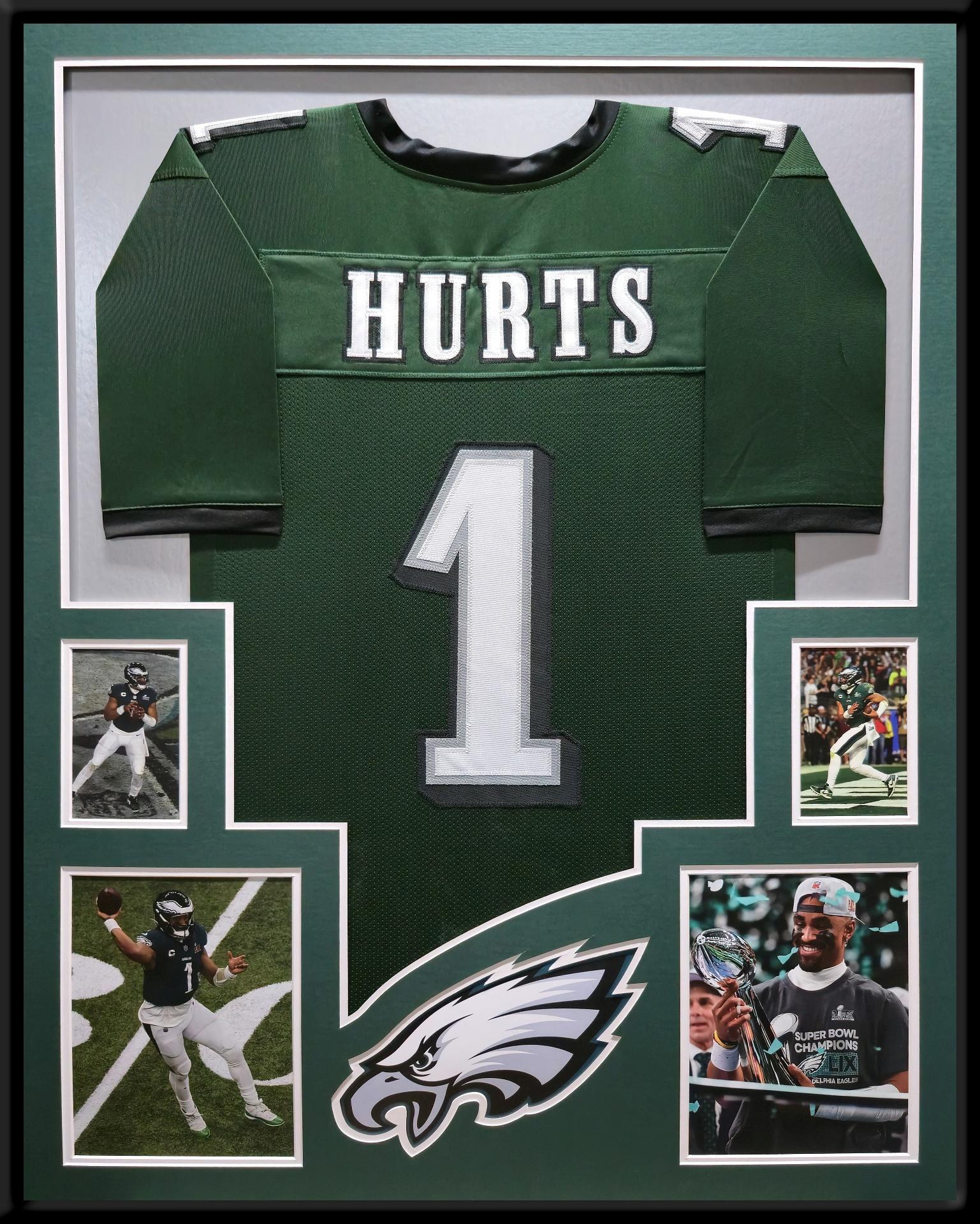 Custom frame measures 34" x 42" in size and features an unsigned jersey of Jalen Hurts. See photos for condition of the frame.