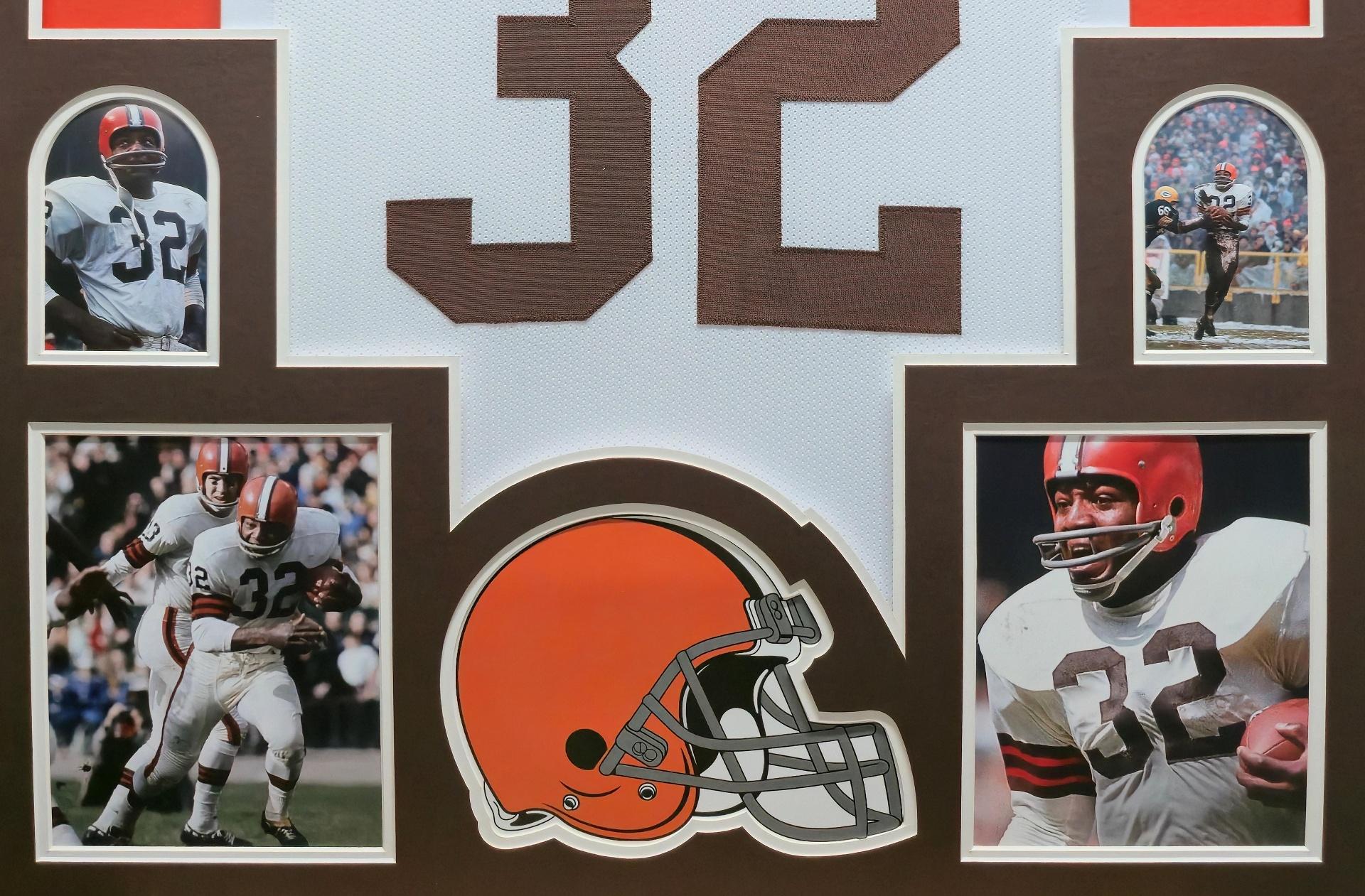 Custom frame measures 34" x 42" in size and features an unsigned jersey of Jim Brown. See photos for condition of the frame.