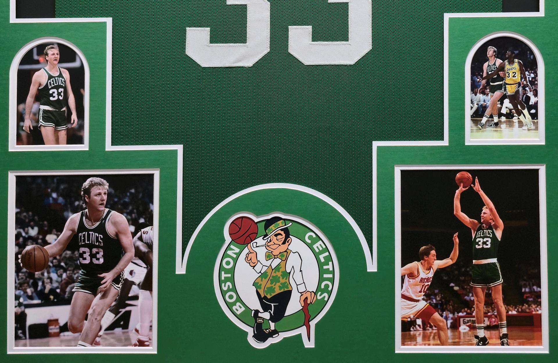 Custom frame measures 34" x 42" in size and features an unsigned jersey of Larry Bird. See photos for condition of the frame.