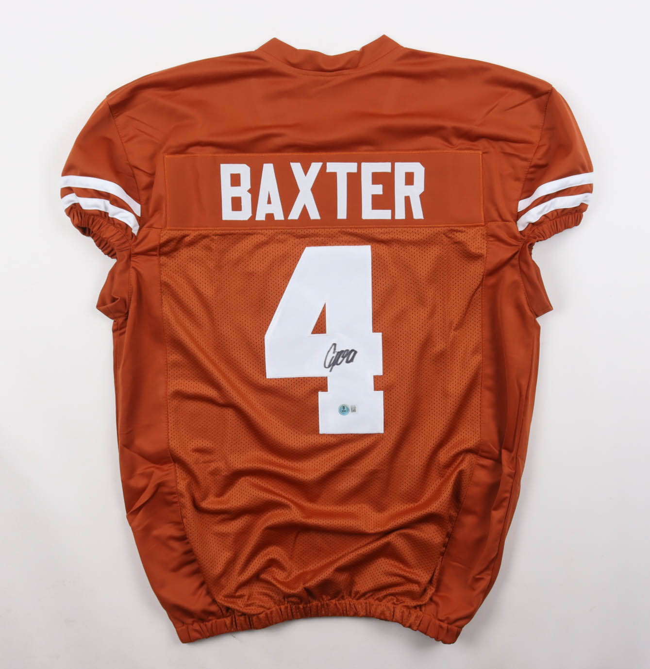 Custom football jersey. Everything sewn on, size XL. Hand-signed by CJ Baxter.