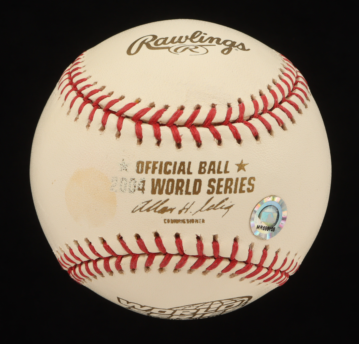 Rawlings Official 2004 World Series Baseball. Hand-signed by David Ortiz (Boston Red Sox, HOF). Please note, the baseball is naturally toning and stained.
