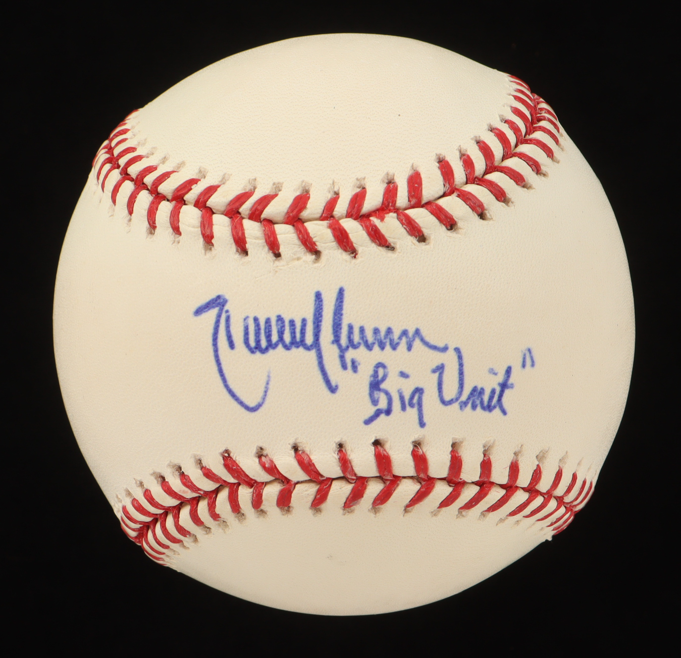 Rawlings Official Major League Baseball. Hand-signed and inscribed by Randy Johnson (Arizona Diamondbacks, HOF). Please note, there are stains throughout the baseball.