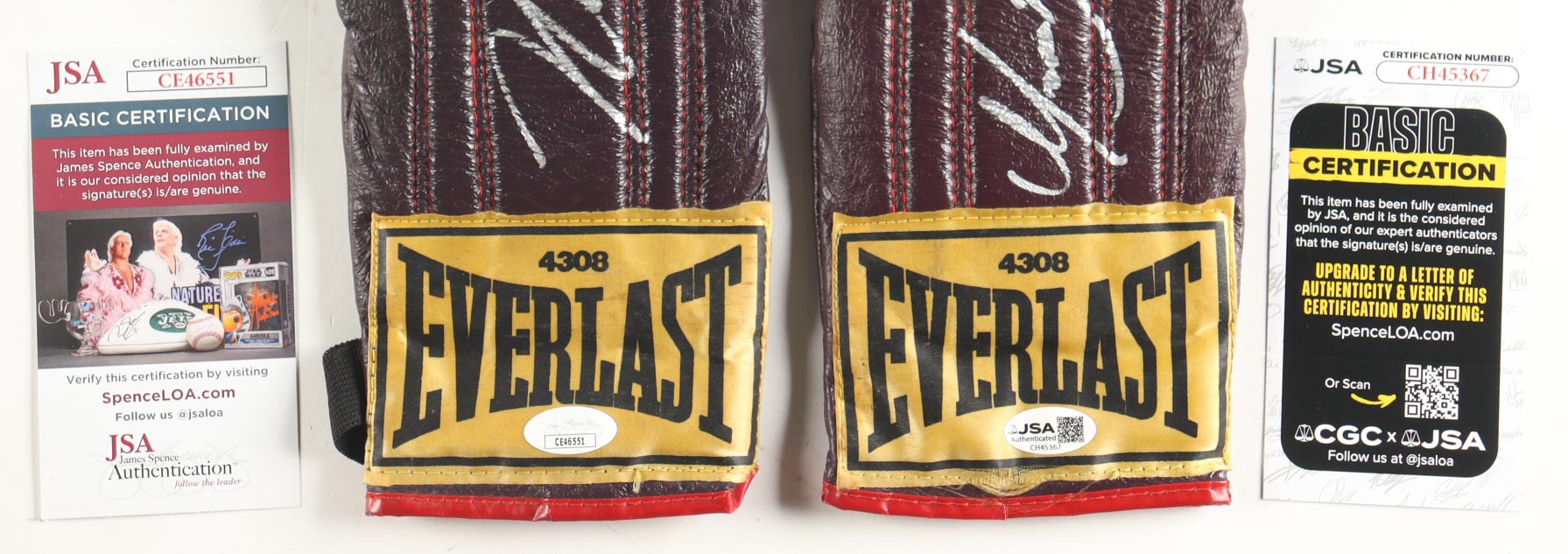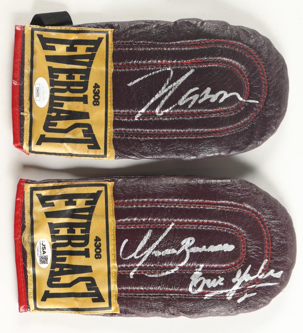 Vintage Everlast sparring boxing gloves. Right glove is hand-signed by Julio Cesar Chavez (HOF). Left glove is hand-signed by Marco Barrera (HOF) & Erik Morales (HOF).