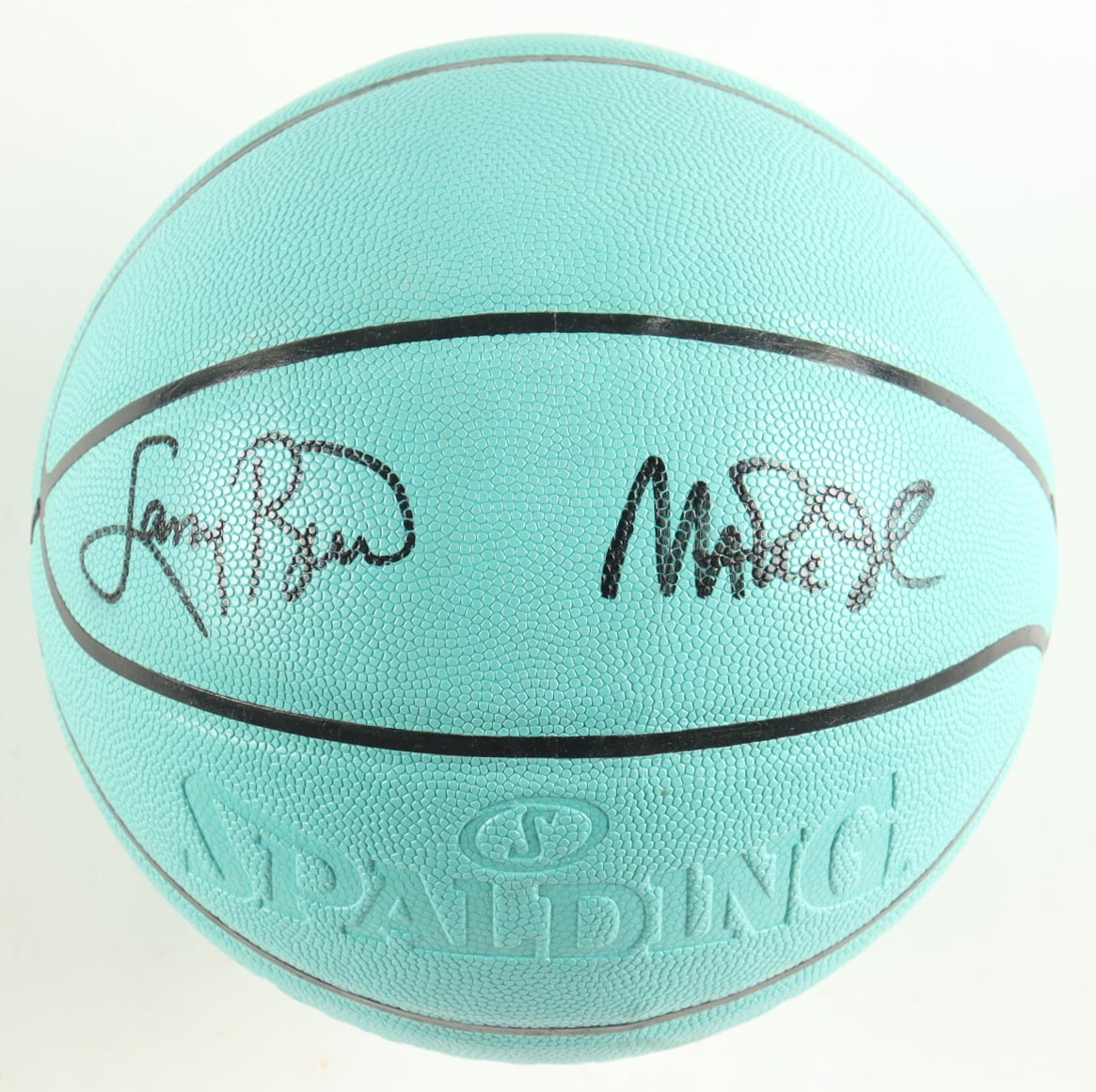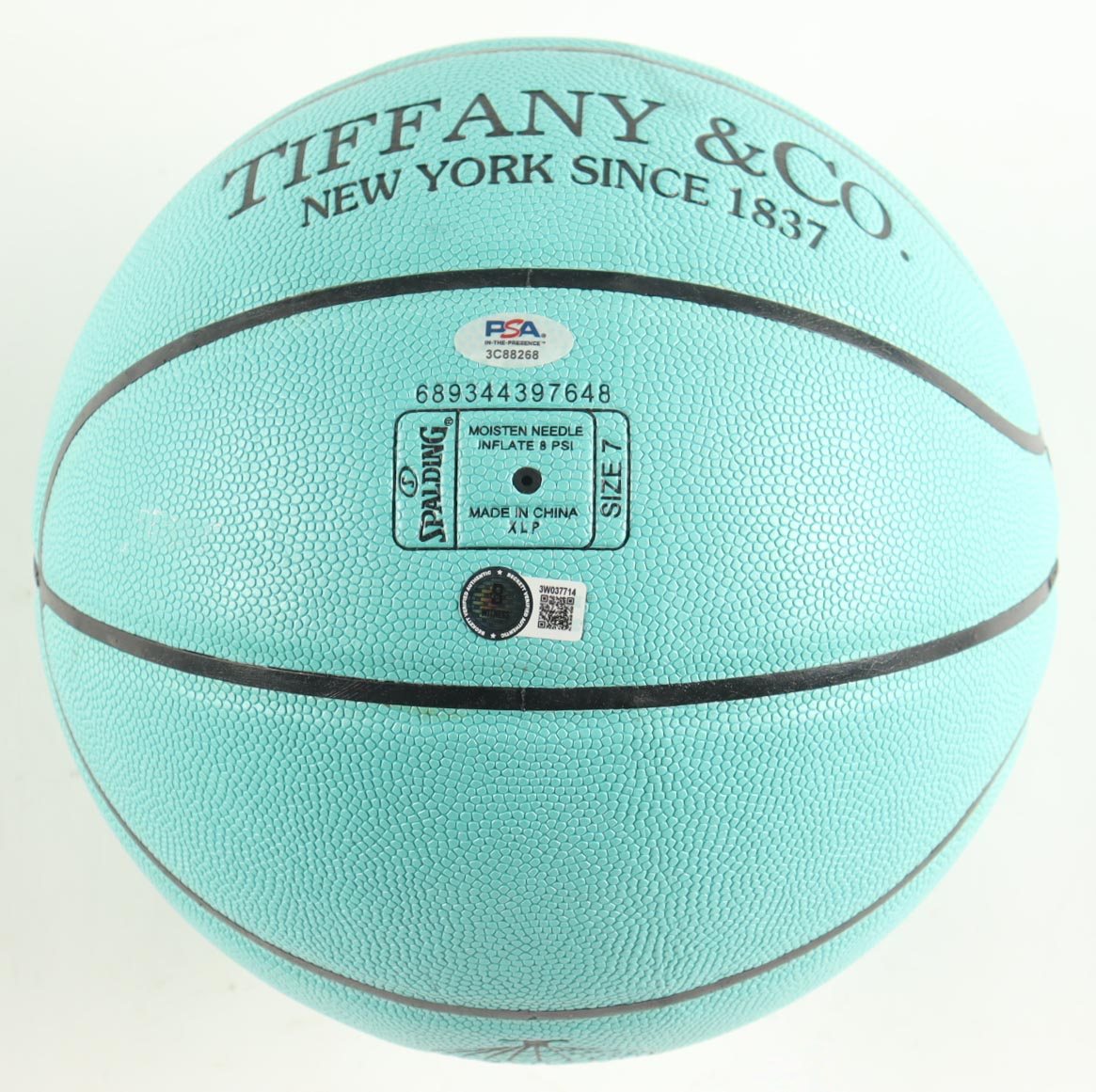 Spalding Tiffany & Co Edition basketball With Display Stand has been hand-signed by Larry Bird (Boston Celtics, HOF) & Magic Johnson (Los Angeles Lakers, HOF).