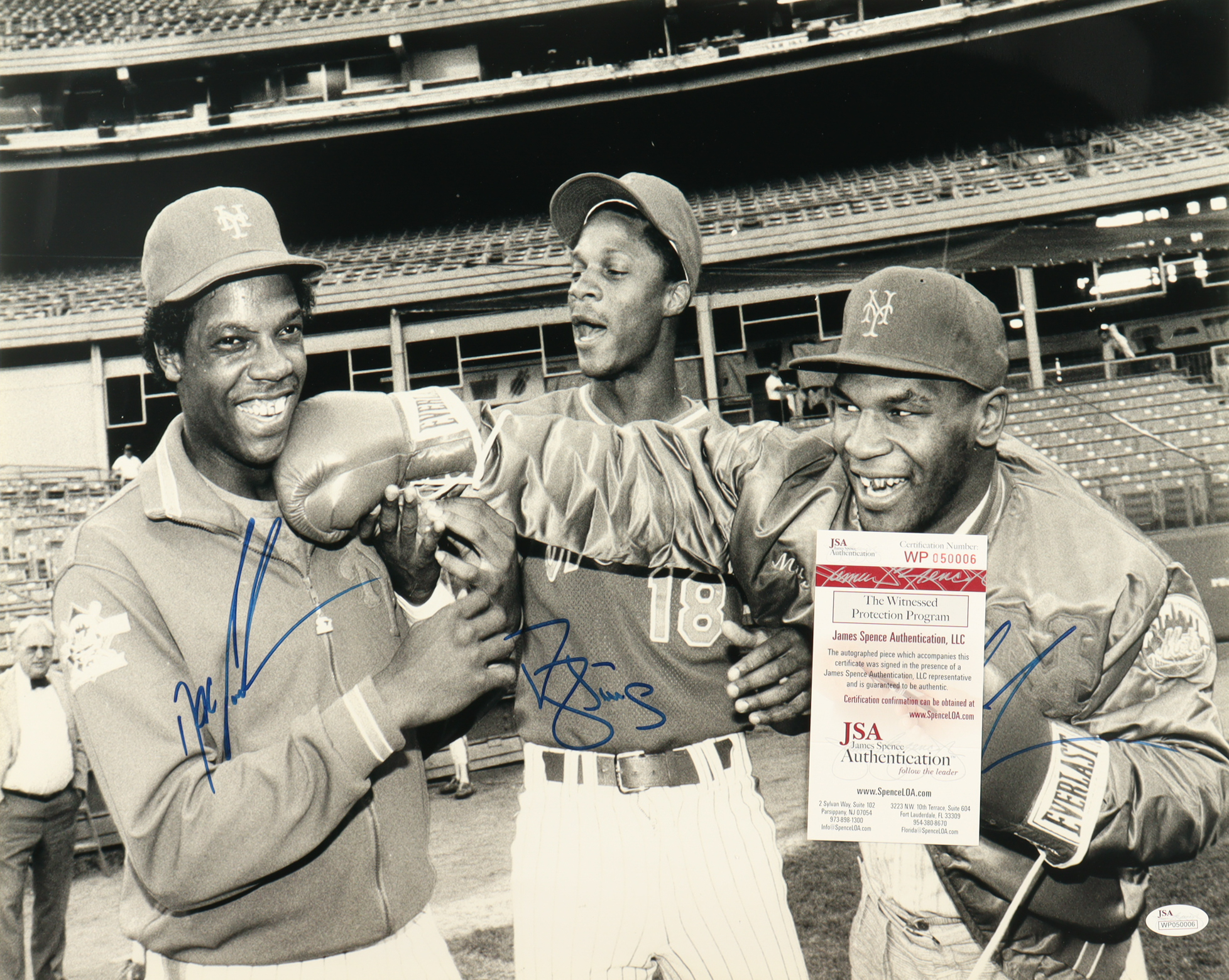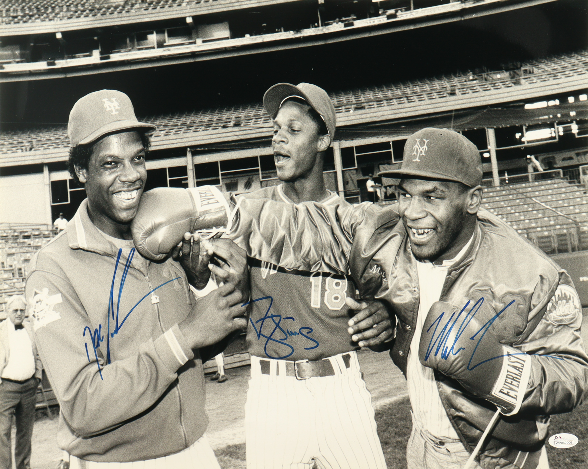 Photograph measures 16" x 20" in size. Hand-signed by Mike Tyson (HOF), Dwight Gooden (New York Mets), and Darryl Strawberry (New York Mets).