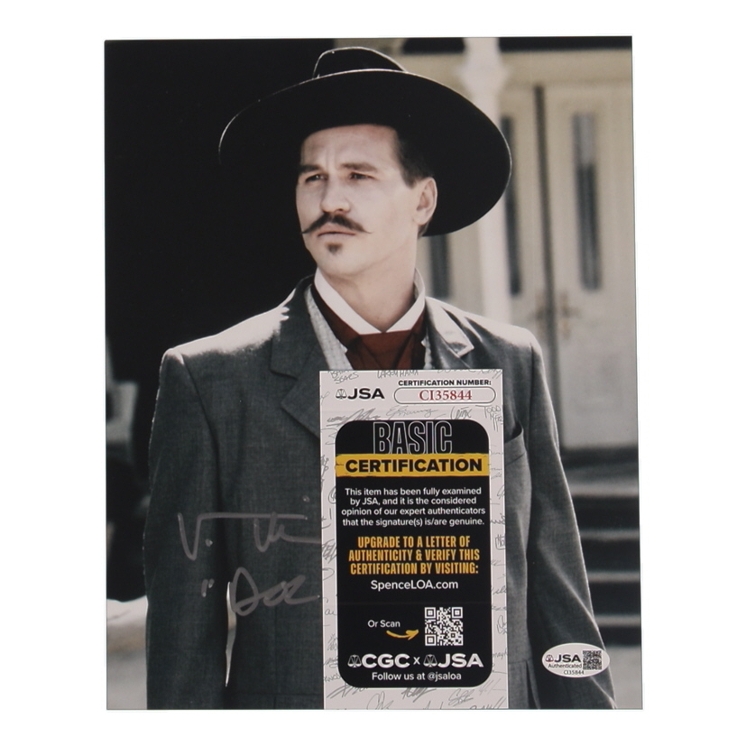 Photo measures 8" x 10" in size and has been hand-signed inscribed by Val Kilmer (D. 2025, Doc Holiday).