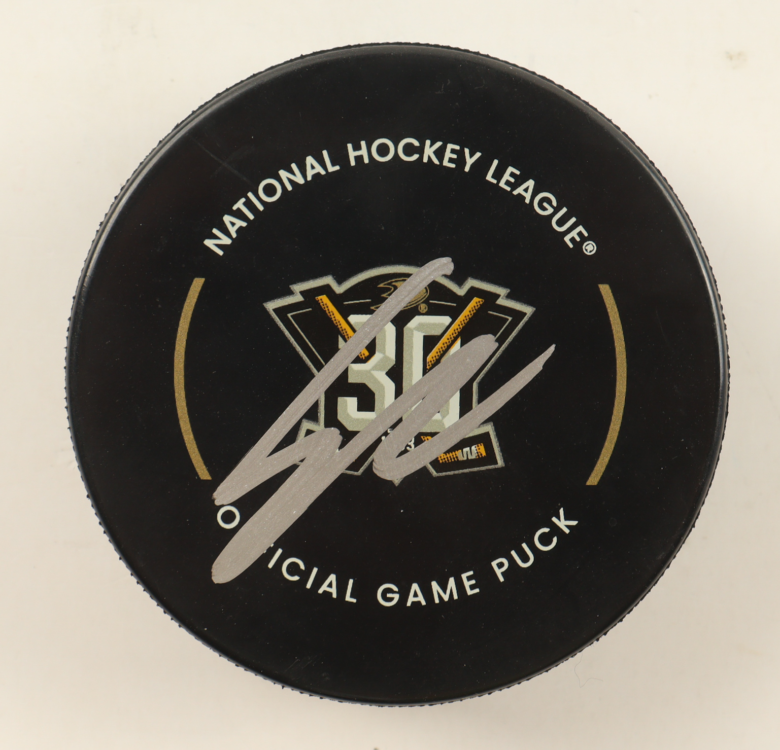 Anaheim Ducks 30th Anniversary Logo Hockey Puck. Hand-signed by Leo Carlsson.