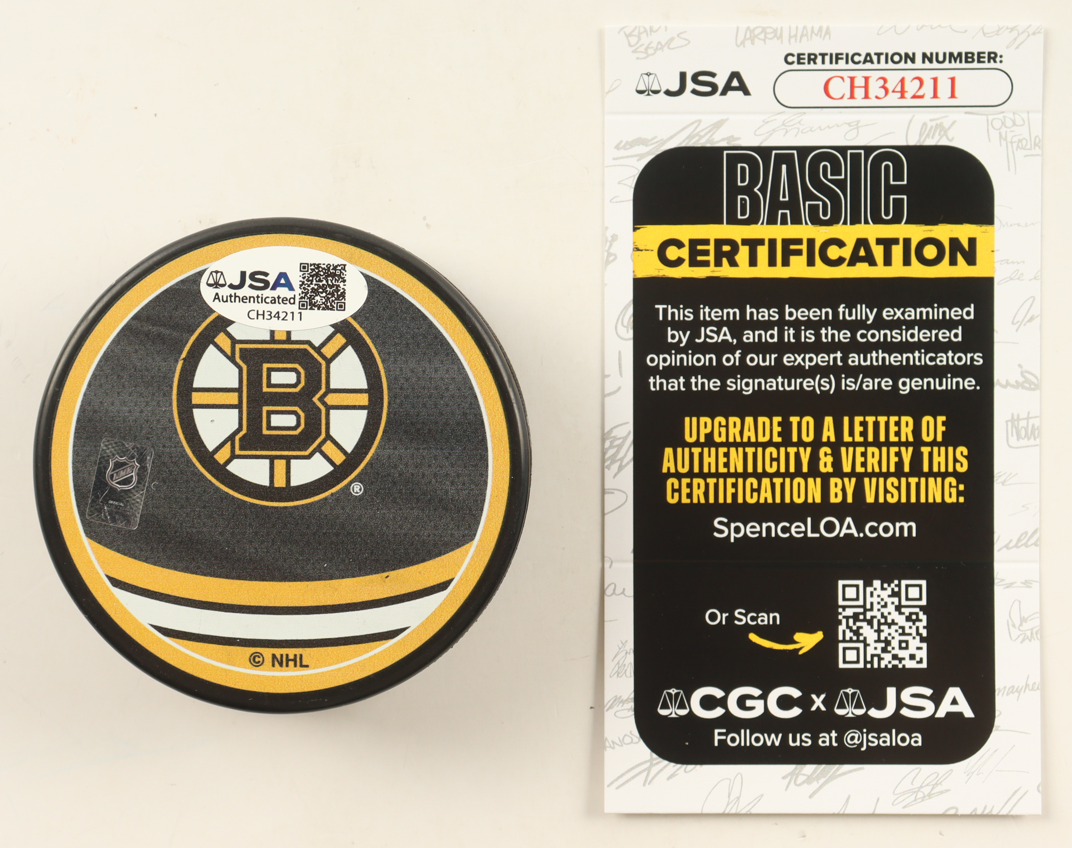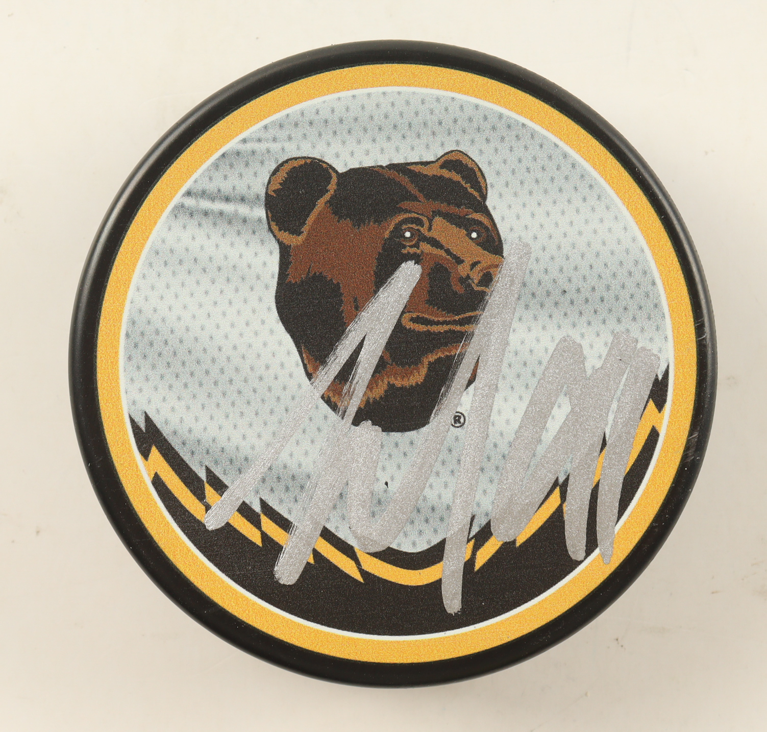 Boston Bruins Logo Hockey Puck. Hand-signed by Nikita Zadorov.