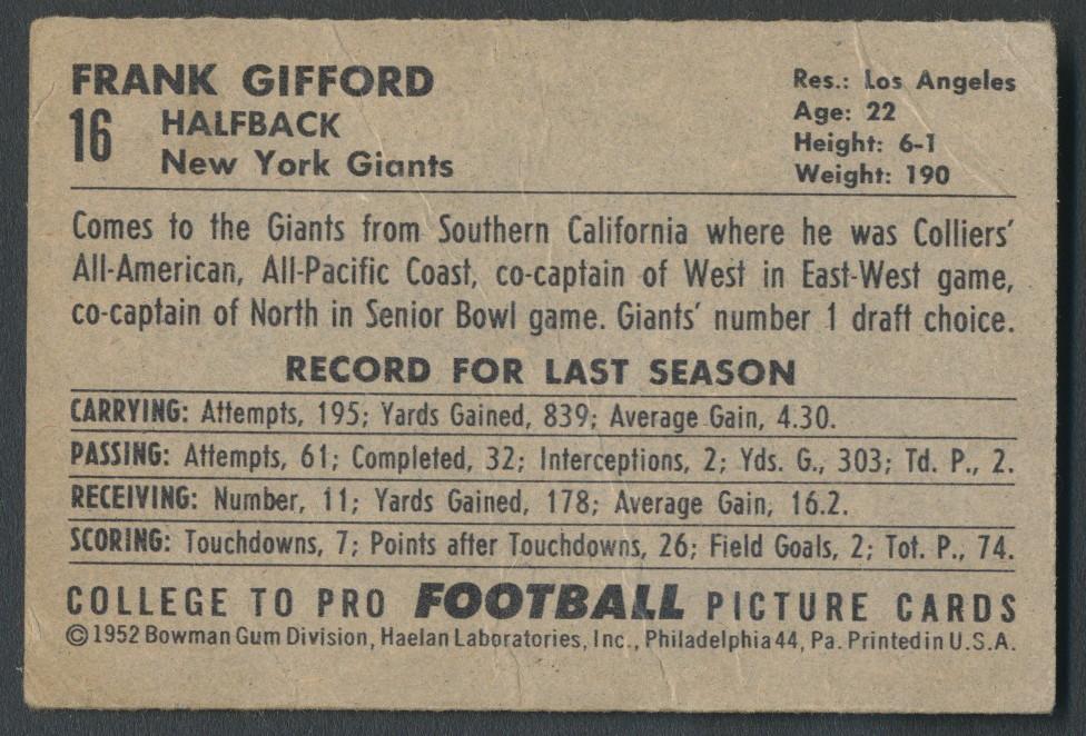 Frank Gifford 1952 Bowman Small #16 RC