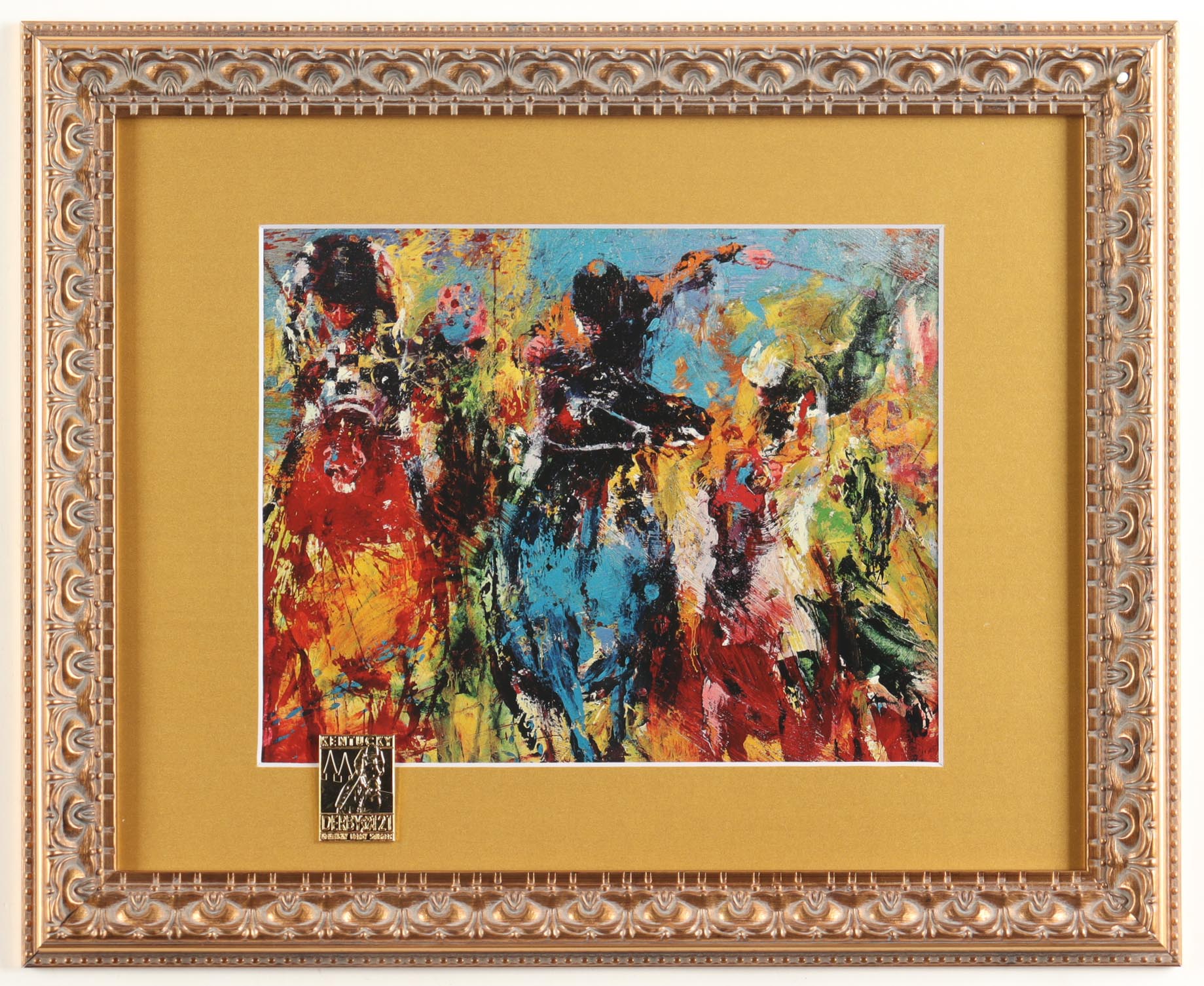 Custom frame measures approximately 13.25" x 16.25" in size and features an art print from LeRoy Neiman (D. 2012) depicting the Kentucky Derby. The display also includes a vintage Kentucky Derby starter pin. Please note, the display is unsigned.