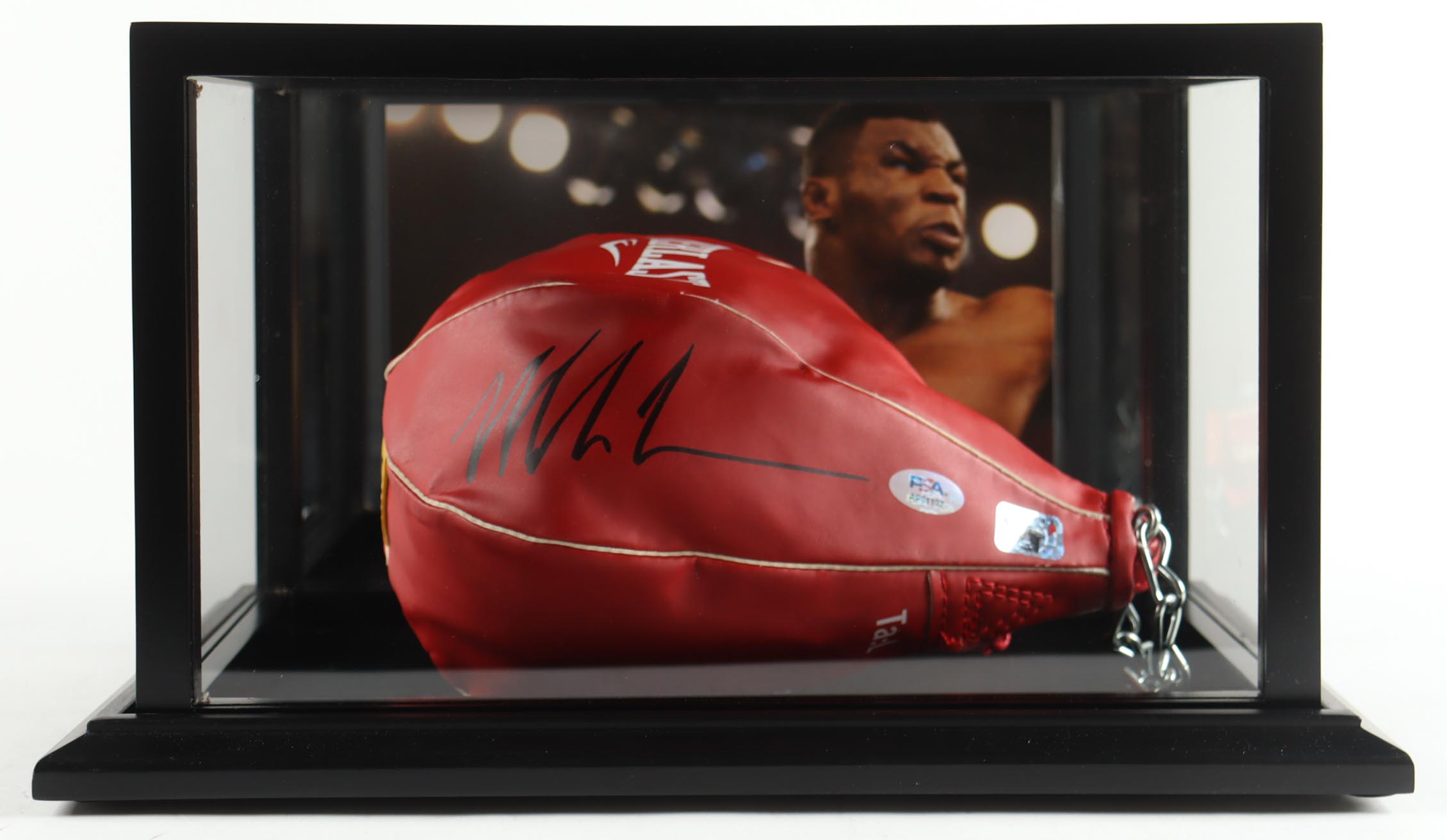 Mike Tyson Signed Everlast Gyro Speed Bag with Photo-Back Display Case (PSA & Tyson)