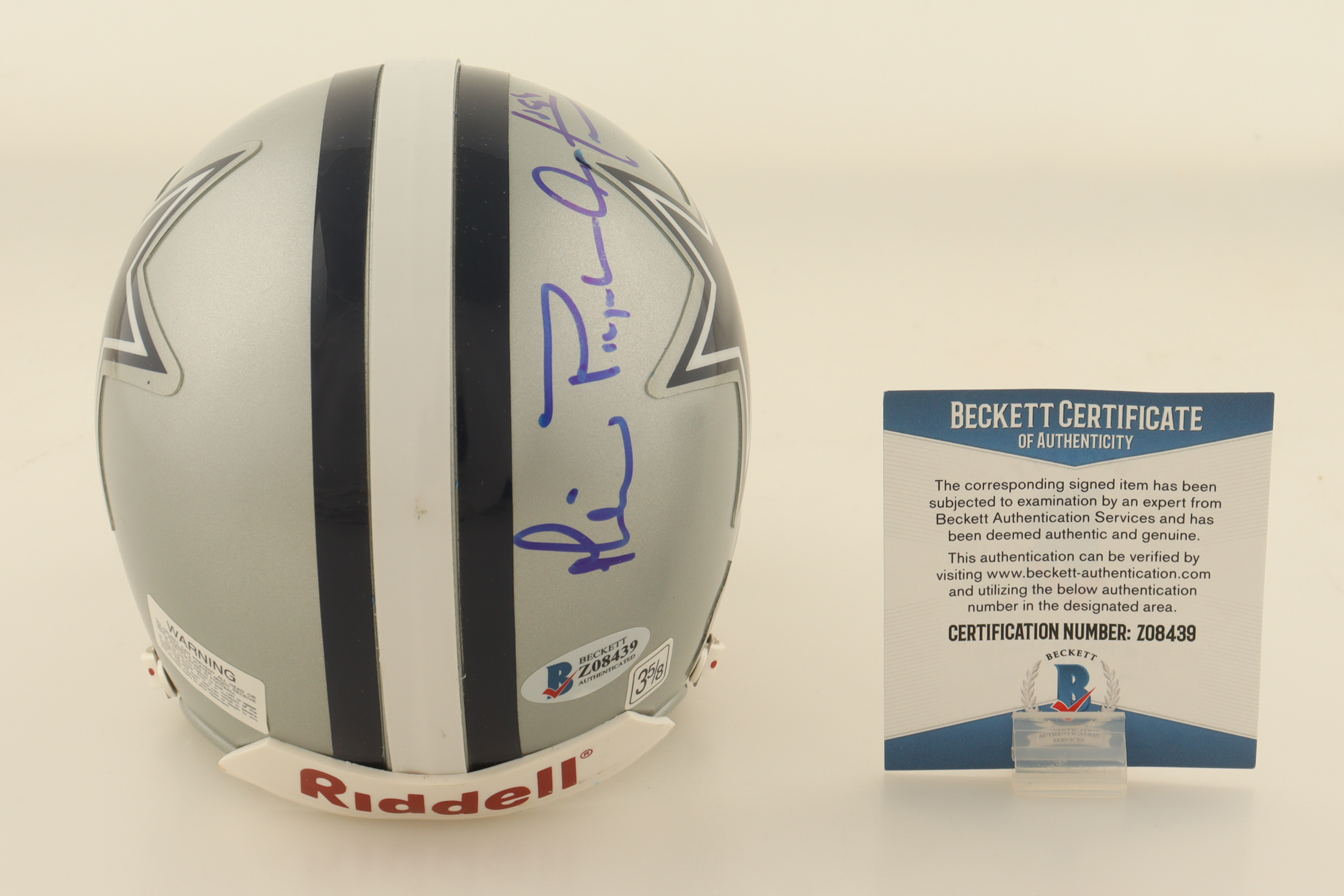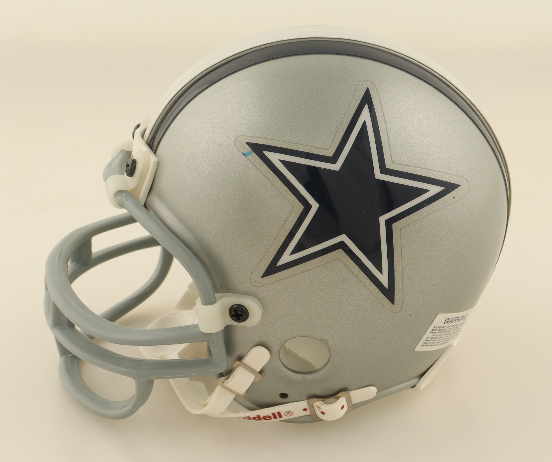 Riddell Dallas Cowboys mini helmet. Hand-signed by Michael Irvin (HOF). Please note, there is a stray pen mark on the decal opposite the signature side.