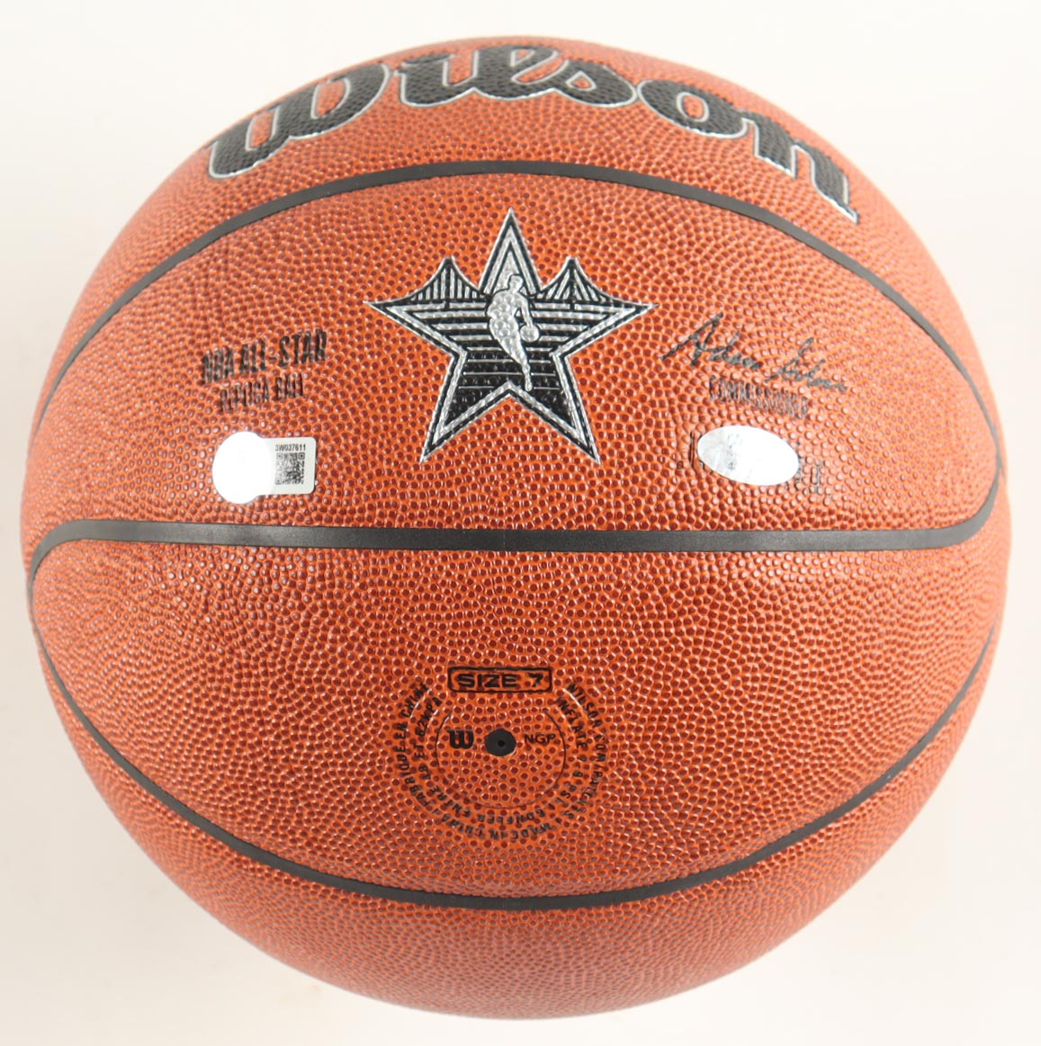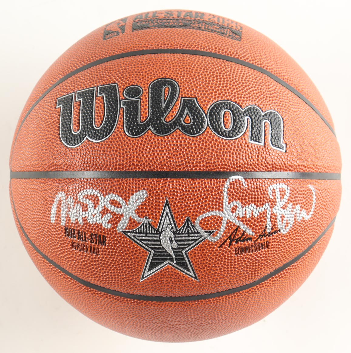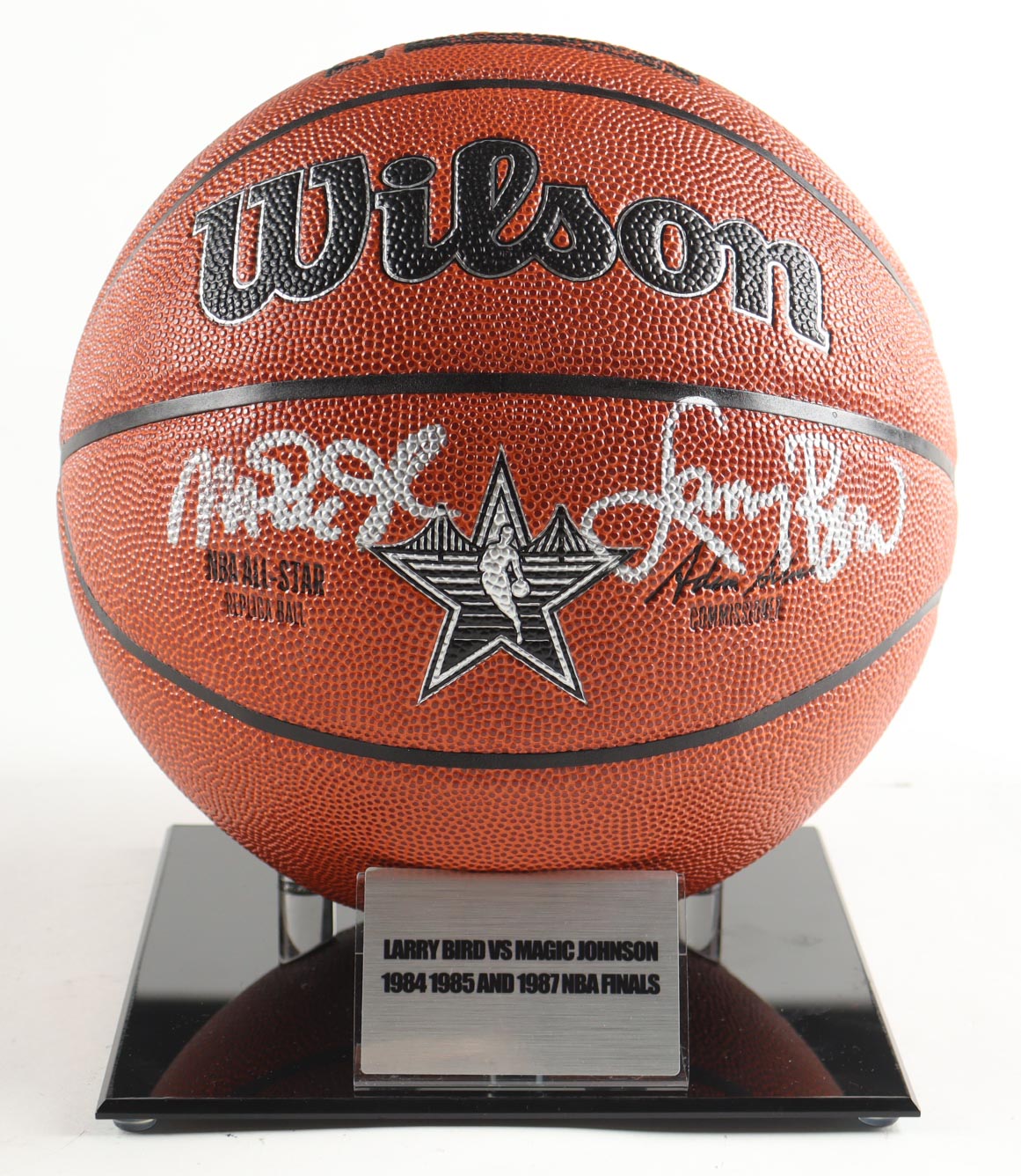 NBA Silver All-Star Logo Basketball. Hand-signed by Magic Johnson (Los Angeles Lakers, HOF) and Larry Bird (Boston Celtics, HOF). The display stand is included as shown.