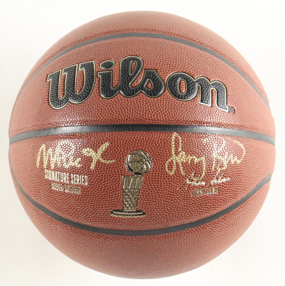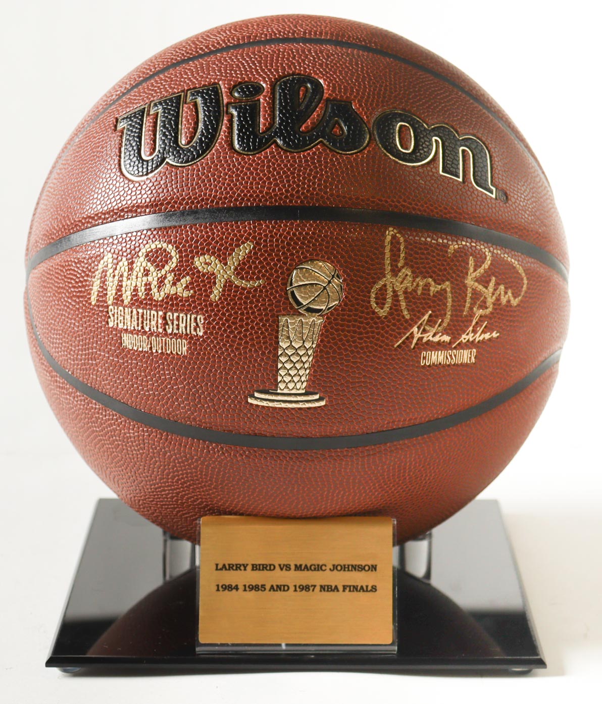 Wilson Signature Series Indoor/Outdoor NBA Finals Trophy Special Edition basketball. Hand-signed by Magic Johnson (Los Angeles Lakers, HOF) and Larry Bird (Boston Celtics, HOF). Includes display stand.