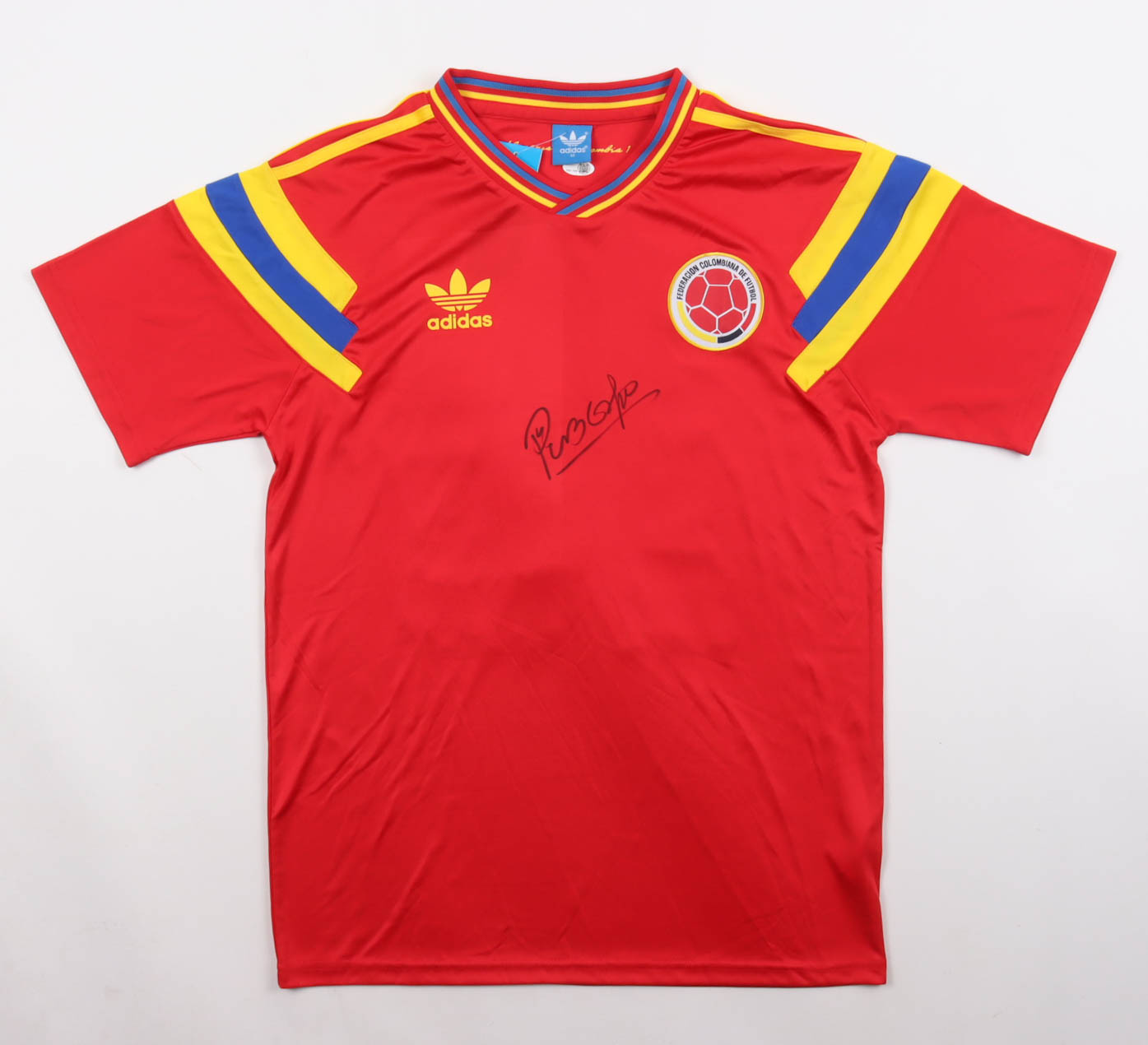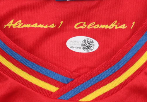 Adidas jersey with everything printed/sewn on, size M. Hand-signed by Carlos Valderrama (Colombia National Football Team).