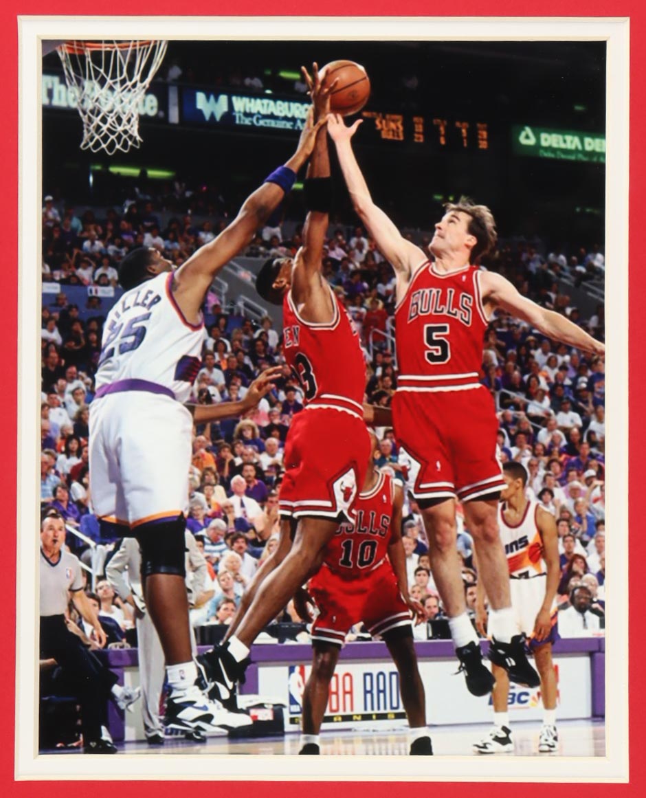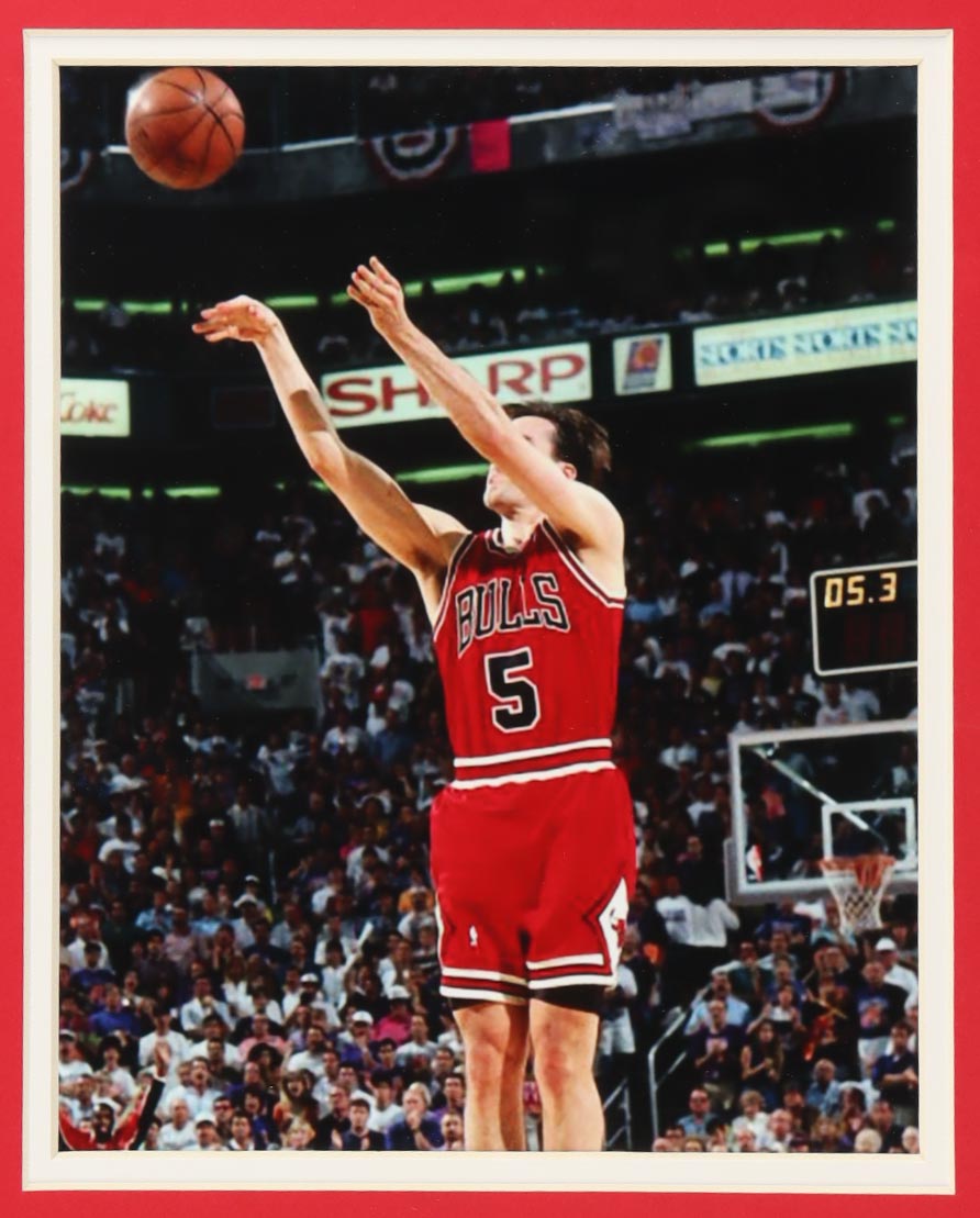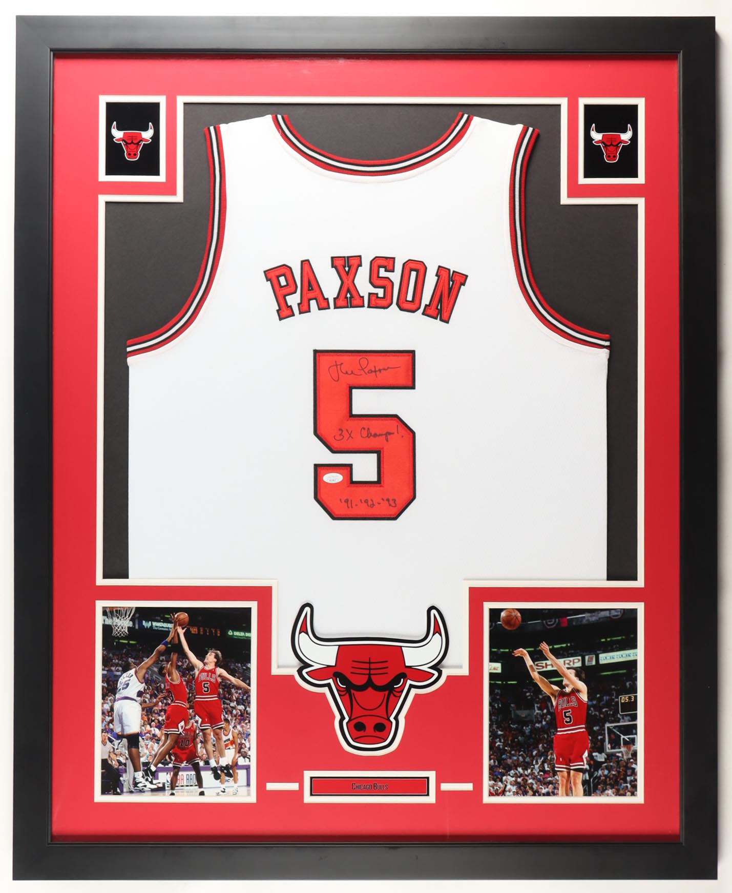 Custom Frame measures 35" x 43" in size. Jersey is hand-signed by John Paxson (Chicago Bulls). Display also features (2) unsigned 8" x 10" photographs.